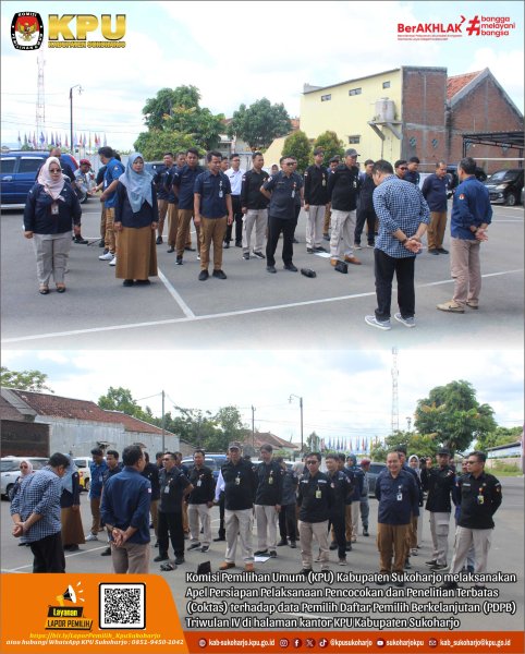 Sukoharjo — Komisi Pemilihan Umum (KPU) Kabupaten Sukoharjo melaksanakan Apel Persiapan Pelaksanaan Pencocokan dan Penelitian Terbatas (Coktas) terhadap data Pemilih Daftar Pemilih Berkelanjutan (PDPB) Triwulan IV di halaman kantor KPU Kabupaten Sukoharjo, Selasa (25/11/2025). Apel diikuti oleh seluruh jajaran KPU Kabupaten Sukoharjo dan jajaran Bawaslu Kabupaten Sukoharjo. Pelaksanaan apel dipimpin langsung oleh Ketua KPU Kabupaten Sukoharjo. Kegiatan ini menjadi langkah awal dalam memastikan proses Coktas berjalan dengan baik, akurat, dan sesuai ketentuan peraturan perundang-undangan. Dalam arahannya, Ketua KPU Kabupaten Sukoharjo menegaskan bahwa kegiatan Coktas ini merupakan bagian penting dalam menjaga kualitas dan akurasi Data Pemilih Berkelanjutan, khususnya terkait pemutakhiran data Triwulan IV. “Coktas dilakukan untuk memvalidasi data-data pemilih Tidak Memenuhi Syarat (data pemilih meninggal dunia) dan data invalid,” tegasnya. Ketua KPU juga meminta seluruh petugas agar melaksanakan Coktas secara teliti, profesional, dan berkoordinasi dengan pihak-pihak terkait agar data yang dihasilkan benar-benar akurat. Hal ini penting untuk memastikan daftar pemilih yang digunakan pada pemilihan selanjutnya benar-benar valid dan dapat dipertanggungjawabkan. Sementara itu, kehadiran Bawaslu Kabupaten Sukoharjo dalam apel tersebut menunjukkan komitmen bersama penyelenggara pemilu dalam menjaga akuntabilitas dan transparansi proses pemutakhiran data pemilih. Dengan terlaksananya apel ini, KPU Kabupaten Sukoharjo siap menjalankan tahapan Coktas PDPB Triwulan IV sebagai bagian dari upaya berkelanjutan dalam mewujudkan data pemilih yang mutakhir, akurat, dan berkualitas. ....