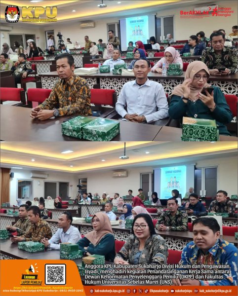 Sukoharjo — Anggota KPU Kabupaten Sukoharjo Divisi Hukum dan Pengawasan, Isyadi, menghadiri kegiatan Penandatanganan Kerja Sama antara Dewan Kehormatan Penyelenggara Pemilu (DKPP) dan Fakultas Hukum Universitas Sebelas Maret (UNS). Kegiatan tersebut dirangkaikan dengan Seminar Nasional bertema “Integritas Penyelenggara Pemilu dan Masa Depan Demokrasi Indonesia” dan digelar pada Kamis, 27 November 2025 di Aula Gedung 3 Fakultas Hukum UNS. Acara dibuka dengan sambutan Dekan Fakultas Hukum UNS, Dr. Muhammad Rustamaji, S.H., M.H., yang dilanjutkan dengan sambutan sekaligus pembukaan oleh Rektor UNS Prof. Dr. Hartono, dr., M.Si.. Kedua pimpinan tersebut menekankan pentingnya penguatan integritas dan etika bagi penyelenggara pemilu dalam menjaga kualitas demokrasi. Pada sesi inti, Ketua DKPP Heddy Lugito dan Dekan Fakultas Hukum UNS Dr. Muhammad Rustamaji menandatangani dokumen kerja sama sebagai bentuk komitmen kolaborasi kelembagaan. Penandatanganan Perjanjian Kerja Sama (PKS) turut dilakukan oleh Sekretaris DKPP bersama jajaran Fakultas Hukum UNS, disertai penyerahan cenderamata dan sesi foto bersama. Setelah itu, Heddy Lugito juga hadir sebagai Keynote Speaker membawakan materi “Menegakkan Etika Penyelenggara Pemilu: Pilar Integritas dan Kepercayaan Publik dalam Demokrasi.” KPU Kabupaten Sukoharjo hadir sebagai salah satu peserta undangan, termasuk perwakilannya, Isyadi. Partisipasi ini menjadi wujud komitmen KPU Sukoharjo dalam memperkuat integritas, profesionalitas, serta membangun sinergi kelembagaan untuk mendukung penyelenggaraan Pemilu yang akuntabel dan berintegritas. ....