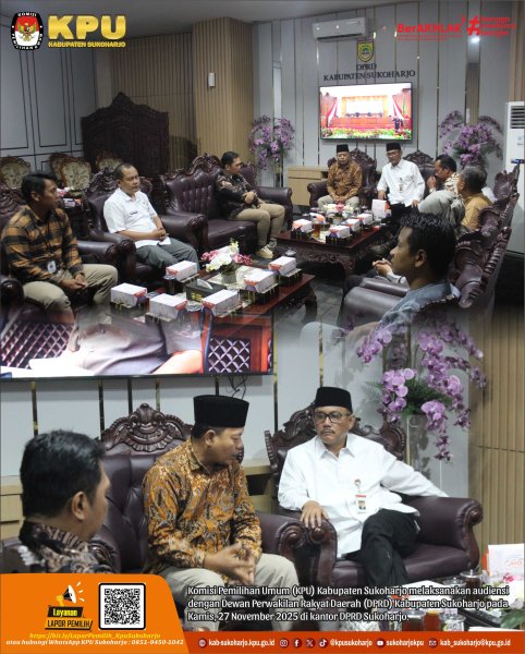 Sukoharjo - Komisi Pemilihan Umum (KPU) Kabupaten Sukoharjo melaksanakan audiensi dengan Dewan Perwakilan Rakyat Daerah (DPRD) Kabupaten Sukoharjo pada Kamis, 27 November 2025 di kantor DPRD Sukoharjo. Rombongan KPU dipimpin oleh Ketua KPU Sukoharjo, Syakbani Eko Raharjo bersama Arief Wicaksono (Divisi Perencanaan, Data dan Informasi) didampingi Boedi Sulistyo (Sekretaris), Novi Andari (Kasubbag Rendatin), Agung Siswanto (Kasubbag TPPH), serta Anton Praptono (Kasubbag Parhumas dan SDM). Kedatangan KPU Sukoharjo diterima langsung oleh unsur pimpinan DPRD Kabupaten Sukoharjo, yaitu Ketua DPRD, Nurjayanto, didampingi para Wakil Ketua DPRD: Sardjono, Joko Nugroho, dan Sigid Budi Raharjo, serta Sekretaris DPRD Basuki Budi S. beserta jajaran sekretariat DPRD. Dalam audiensi tersebut, KPU Sukoharjo menyampaikan sejumlah program dan kegiatan pasca Pemilihan, antara lain penguatan kelembagaan, pengelolaan dan penataan arsip, sosialisasi dan pendidikan pemilih berkelanjutan, serta pelaksanaan Pemutakhiran Data Pemilih Berkelanjutan (PDPB). KPU juga menjelaskan bahwa saat ini tengah berlangsung PDPB Triwulan IV, termasuk kegiatan Coktas (Pencocokan dan Penelitian Terbatas) untuk memvalidasi data pemilih Tidak Memenuhi Syarat (TMS) dan data invalid secara langsung kepada masyarakat. Selain itu, KPU Sukoharjo memohon dukungan DPRD dalam upaya memperluas sosialisasi PDPB kepada masyarakat. Pimpinan DPRD Kabupaten Sukoharjo menyambut baik penyampaian KPU dan menyatakan komitmennya untuk memberikan dukungan penuh. DPRD juga memastikan bahwa masukan dan permohonan dukungan dari KPU akan ditindaklanjuti sesuai kewenangan yang dimiliki. ....