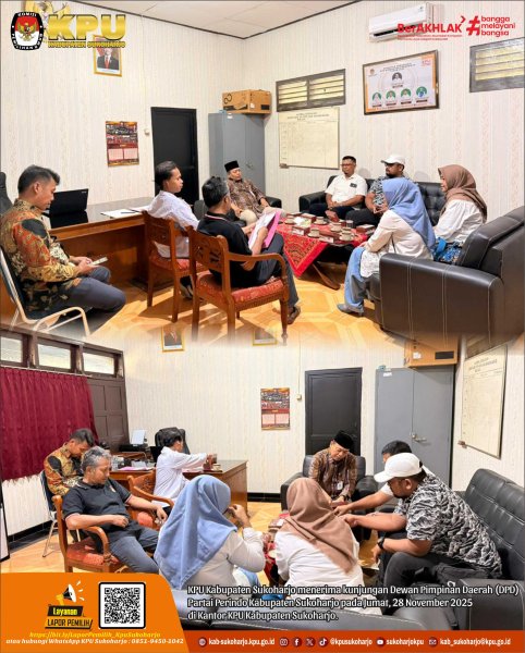 KPU Kabupaten Sukoharjo menerima kunjungan Dewan Pimpinan Daerah (DPD) Partai Perindo Kabupaten Sukoharjo pada Jumat, 28 November 2025 di Kantor KPU Kabupaten Sukoharjo. Rombongan diterima oleh Ketua KPU Sukoharjo, Syakbani Eko Raharjo, bersama Anggota KPU Divisi Teknis Penyelenggaraan, Bambang Muryanto. Kegiatan ini dilaksanakan sebagai ajang silaturahmi sekaligus penyampaian perubahan struktur kepengurusan Partai Perindo Kabupaten Sukoharjo. Dalam kesempatan tersebut, pihak partai memperkenalkan susunan pelaksana tugas pengurus baru, yaitu BRM Nugroho Iman sebagai Plt. Ketua, Santi Yuliana sebagai Plt. Wakil Ketua, Andy Purwanto sebagai Plt. Sekretaris, Ginanjar Saktyo Hutomo sebagai Plt. Wakil Sekretaris, dan Lilis Setyowati sebagai Plt. Bendahara. Susunan ini merupakan kepengurusan terbaru yang ditetapkan DPP Partai Perindo. Selain perkenalan pengurus, perwakilan partai juga memohon arahan terkait proses administrasi perubahan kepengurusan. Menanggapi hal tersebut, KPU Sukoharjo memberikan penjelasan bahwa pembaruan data kepengurusan wajib dilakukan melalui Sistem Informasi Partai Politik (SIPOL) agar tercatat resmi dan sesuai ketentuan yang berlaku. KPU Kabupaten Sukoharjo menyambut baik komunikasi yang terjalin dan berharap koordinasi antara partai politik dan KPU terus berjalan dengan baik guna mendukung kelancaran dan akuntabilitas penyelenggaraan kepemiluan di Kabupaten Sukoharjo. ....