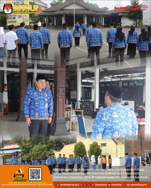 KPU Kabupaten Sukoharjo melaksanakan Upacara Peringatan Hari Ulang Tahun Korps Pegawai Republik Indonesia (KORPRI) ke-54 Tahun 2025 pada Senin, 1 Desember 2025, di halaman kantor KPU Kabupaten Sukoharjo. Upacara diikuti oleh jajaran komisioner dan sekretariat KPU Kabupaten Sukoharjo. Sekretaris KPU Kabupaten Sukoharjo, Boedi Sulistyo, bertindak sebagai Pembina upacara sekaligus membacakan sambutan Ketua Umum Dewan Pengurus KORPRI Nasional. Dalam sambutan tersebut disampaikan bahwa momentum HUT KORPRI ke-54 dengan tema “Bersatu, Berdaulat, Bersama KORPRI Mewujudkan Indonesia Maju” menjadi pengingat bahwa ASN harus terus menjaga persatuan, memperkuat integritas, menegakkan netralitas, dan meningkatkan profesionalisme. Ketua Umum menekankan bahwa KORPRI merupakan kekuatan moral dan penggerak birokrasi yang harus adaptif terhadap era digital, bekerja lebih cepat, efisien, serta memberikan pelayanan publik yang transparan dan berkualitas. Beliau juga mengajak seluruh ASN untuk siap siaga, menjaga nama baik KORPRI, menjunjung etika profesi, serta terus berinovasi demi mewujudkan pemerintahan yang bersih dan efektif. Upacara berlangsung khidmat dan menjadi momentum bagi seluruh ASN di lingkungan KPU Kabupaten Sukoharjo untuk memperkuat komitmen pengabdian sebagai pelayan masyarakat, sekaligus menegaskan kembali peran KORPRI sebagai perekat dan pemersatu bangsa. ....