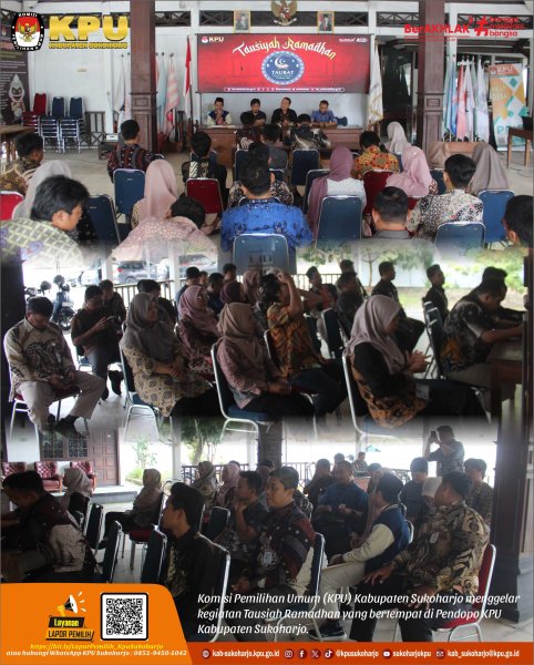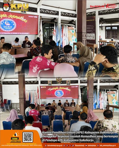 Sukoharjo — Jumat, 13 Maret 2026, KPU Kabupaten Sukoharjo melaksanakan kegiatan rutin selama bulan Ramadhan 1447 H dengan tajuk TAUBAT (Tausiyah Bulan Ramadhan). Kegiatan ini digelar di Pendopo KPU Kabupaten Sukoharjo mulai pukul 14.00 WIB hingga selesai, dan diikuti oleh seluruh jajaran Komisioner serta Sekretariat KPU Kabupaten Sukoharjo. Acara dibuka oleh Ketua KPU Kabupaten Sukoharjo, Syakbani Eko Raharjo, kemudian dilanjutkan dengan pembacaan ayat suci Al-Qur’an oleh Ade Yosvita Mediastuti, Pejabat Fungsional Penata Kelola Pemilu Ahli Pertama di lingkungan KPU Kabupaten Sukoharjo. Kegiatan bertajuk TAUBAT ini diisi dengan penyampaian tausiyah keagamaan yang pada kesempatan ini disampaikan langsung oleh Ketua KPU Kabupaten Sukoharjo. Dalam tausiyahnya, beliau menyampaikan beberapa poin penting, di antaranya agar setiap insan senantiasa mengamalkan ilmu dan amalan baik yang telah diperoleh dari para guru, ulama, orang tua, maupun dari berbagai sumber bacaan. Selain itu, beliau juga mengingatkan bahwa pada sepuluh malam terakhir bulan Ramadhan umat Islam dianjurkan untuk semakin meningkatkan ibadah dan berikhtiar meraih malam Lailatul Qadar, yaitu malam yang kemuliaannya lebih baik dari seribu bulan. Salah satu amalan yang dianjurkan adalah mendekatkan diri kepada Allah SWT melalui i’tikaf, memperbanyak doa, dzikir, serta memperbanyak amal kebaikan. Melalui kegiatan ini, diharapkan seluruh jajaran KPU Kabupaten Sukoharjo dapat memanfaatkan momentum bulan suci Ramadhan untuk meningkatkan keimanan, memperkuat nilai-nilai spiritual, serta menumbuhkan semangat kebersamaan dalam menjalankan tugas dan pengabdian sebagai penyelenggara pemilu.