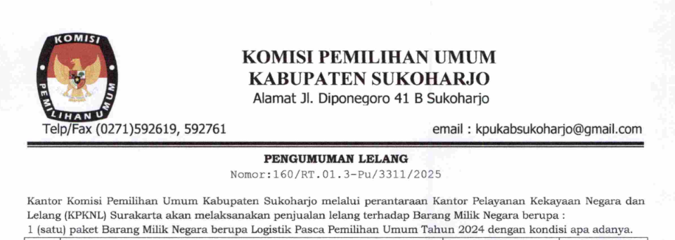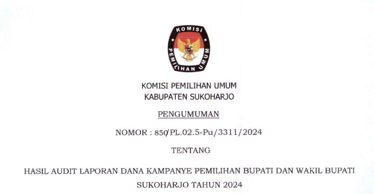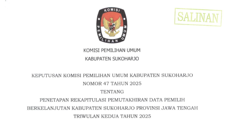 Berikut kami Informasikan Salinan SK Keputusan Komisi Pemilihan Umum Kabupaten Sukoharjo Nomor 1492 Tahun 2024 tentang Perubahan atas Keputusan Keputusan Komisi Pemilihan Umum Kabupaten Sukoharjo Nomor 1490 Tahun 2024 tentang Penetapan Hasil Pemilihan Bupati dan Wakil Bupati Sukoharjo Tahun 2024.