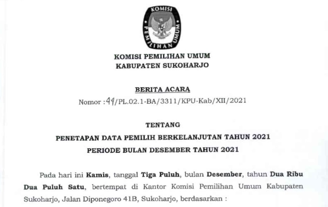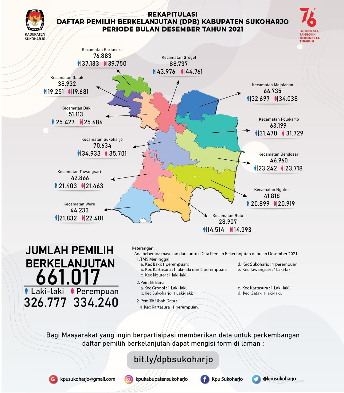 Pers Release KPU Sukoharjo Data Pemilih Berkelanjutan Desember 2021 Tercatat 661.017 Pemilih Pemutakhiran Data Pemilih Berkelanjutan (DPB) menjadi cara Komisi Pemilihan Umum (KPU) Kabupaten Sukoharjo untuk memastikan kualitas data pemilih tetap baik meskipun tidak sedang melaksanakan pemilihan maupun pemilu. Perubahan data sangat dinamis seperti pemilih yang tidak memenuhi syarat masih terdaftar sebagai pemilih. Atau sebaliknya sudah memenuhi syarat tetapi tidak terdaftar sebagai pemilih. Permasalahan tersebut disebabkan karena meninggal dunia, pindah domisili, menjadi TNI/Polri, belum memenuhi syarat usia. Oleh karena itu pentingsekali dilakukan pemutakhiran data secara rutin. KPU Kabupaten Sukoharjo telah melaksanakan Rapat Pleno Penetapan Data Pemilih Berkelanjutan Tahun 2021 Periode Bulan Desember Tahun 2021, Kamis (30/12/21) dengan jumlah rekapitulasi 661.017 pemilih terdiri dari pemilih laki-laki 326.777 dan pemilih perempuan sebanyak 334.240 Rapat pleno dilakukan secara luring di Kantor KPU Kabupaten Sukoharjo dengan memperhatikan protocol kesehatan, dihadiri Ketua dan anggota KPU Kabupaten Sukoharjo, Sekretariat KPU Kabupaten Sukoharjo dan Plt Kasubag dan staf Perdatin KPU Kabupaten Sukoharjo. Sebelumnya KPU Kabupaten Sukoharjo melakukan rapat koordinasi Pemutakhiran Data Pemilih berkelanjutan secara daring bersama stakeholders diantaranya Bawaslu, perwakilan partai politik, Dinas Kependudukan dan Pencatatan Sipil (Dukcapil), dan lain-lain. Pelaksanaan Rakor sesuai Surat Dinas KPU RI Nomor 336/PL.02-SD/01/KPU/IV/2021tertanggal 21 April 2021 tentang Perubahan Surat Ketua KPU RI Nomor 132/Pl.02-SD/01/KPU/II/2021 tentang Pemutakhiran Data Pemilih Berkelanjutan tahun 2021. Hasil Rekapitulasi bulan Desember 2021, di 12 Kecamatan, dan 167 Desa/Kelurahan, sesuai form model A.1-DPB, jumlah potensi pemilih baru sebanyak 4 pemilih (pemula), Pemilih Tidak Memenuhi Syarat (TMS) meninggal dunia sebanyak 7, dan ubah elemen data 1. Bagi warga Kabupaten Sukoharjo, yang belum terdaftar sebagai pemilih, mengalami perubahan status kependudukan, Masuk Pemilih Pemula (baru usia 17 tahun) atau dibawah usia 17 tahun tapi sudah menikah, Pensiunan TNI/Polri, atau ada keluarga yang sudah meninggal dunia, Menjadi anggota TNI/Polri, silahkan mendaftar/Melapor/Memperbaiki Indentitas diri, dengan cara Datang Langsung ke Kantor KPU Kabupaten Sukoharjo, Jl. Diponegoro 41B Sukoharjo, pada hari dan jam kerja serta mengisi Formulir. Atau melapor secara Online Melalui Link http://bit.ly/dpbsukoharjo. (CCP) LINK DOWNLOAD BERITA ACARA DPB