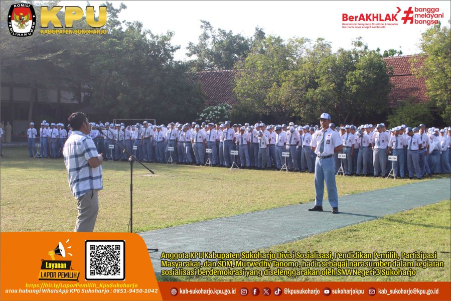 Sukoharjo – Anggota KPU Kabupaten Sukoharjo Divisi Sosialisasi, Pendidikan Pemilih, Partisipasi Masyarakat, dan SDM, Murwedhy Tanomo, hadir sebagai narasumber dalam kegiatan sosialisasi berdemokrasi yang diselenggarakan oleh SMA Negeri 3 Sukoharjo pada Senin (22/9/2025). Acara ini dilaksanakan di lapangan sekolah dan bertepatan dengan pelaksanaan pemilihan ketua OSIS.