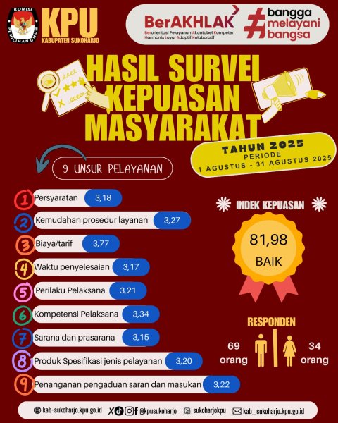Berikut Hasil Survei Kepuasan Masyarakat (SKM) Pelayanan Publik pada KPU Kabupaten Sukoharjo periode 1 Agustus - 31 Agustus 2025.