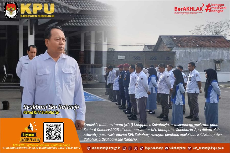 SUKOHARJO – Komisi Pemilihan Umum (KPU) Kabupaten Sukoharjo melaksanakan apel rutin pada Senin, 6 Oktober 2025, di halaman kantor KPU Kabupaten Sukoharjo. Apel diikuti oleh seluruh jajaran sekretariat KPU Sukoharjo dengan pembina apel Ketua KPU Kabupaten Sukoharjo, Syakbani Eko Raharjo.