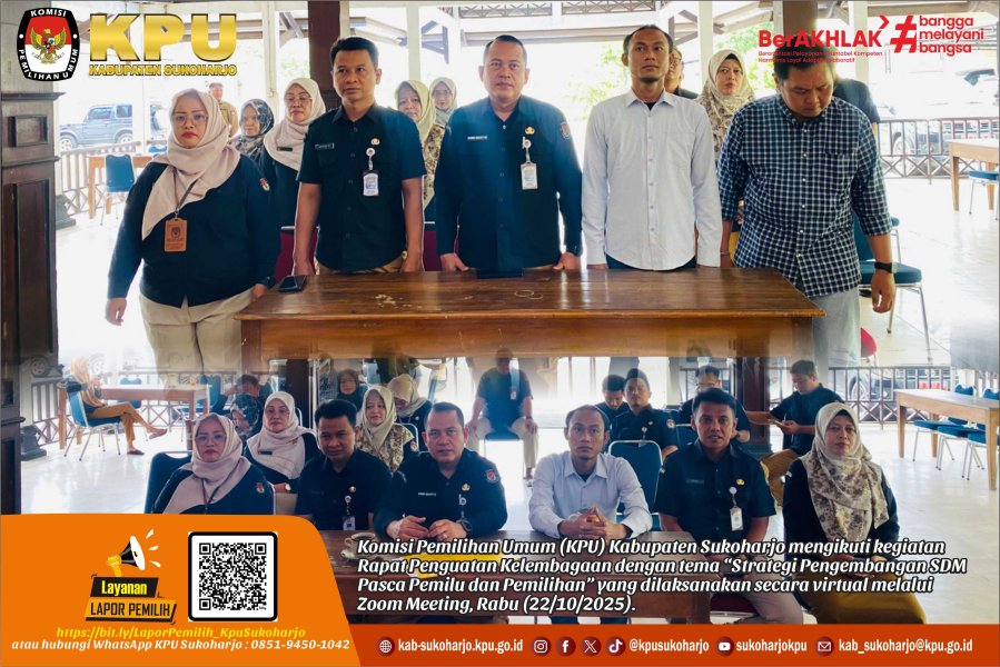 Sukoharjo — Komisi Pemilihan Umum (KPU) Kabupaten Sukoharjo mengikuti kegiatan Rapat Penguatan Kelembagaan dengan tema “Strategi Pengembangan SDM Pasca Pemilu dan Pemilihan” yang dilaksanakan secara virtual melalui Zoom Meeting, Rabu (22/10/2025).