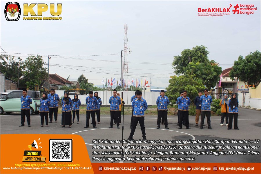 Sukoharjo — KPU Kabupaten Sukoharjo menggelar upacara peringatan Hari Sumpah Pemuda ke-97 di halaman kantor KPU, Selasa (28/10/2025). Upacara diikuti seluruh jajaran komisioner dan sekretariat KPU Sukoharjo, dengan Bambang Muryanto, Anggota KPU Divisi Teknis Penyelenggaraan, bertindak sebagai pembina upacara.