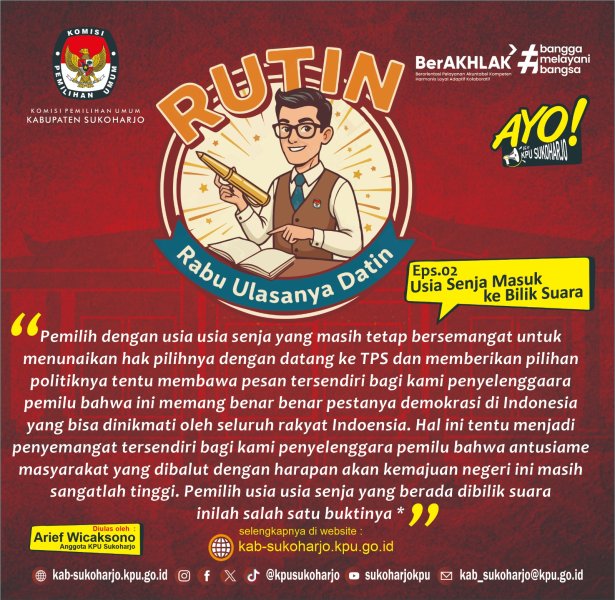 Di Kabupaten Sukoharjo , seperti tertera dalam daftar pemilih tetap masih banyak ditemukan pemilih pemilih yang telah lanjut usia , pemilih disabilitas dan pemilih dengan kategori lainnya. Bahkan Kami memotret di beberapa TPS masih terdapat pemilih lanjut usia dengan usia 109 tahun , 112 tahun dan bahkan ada yang berusia 114 tahun. Memang secara kondisi ada yang masih sehat dan masih bisa datang ke TPS , meskipun ada juga yang kondisinya sudah tidak mampu datang ke TPS sehingga harus didatangi oleh petugas kerumah untuk menunaikan hak pilihnya. Dapat kita bayangkan usia usia diatas 100 tahun masih bisa ke TPS dan berada di dalam bilik suara untuk mencoblos sesuai pilihan nya. Meski kadang butuh bantuan petugas , ataupun kadang ditemani oleh keluarganya , ini menandakan bahwa pelaksanaan pemilu khususnya pada saat pemungutan suara harus memperhatikan hal hal yang khusus ini.