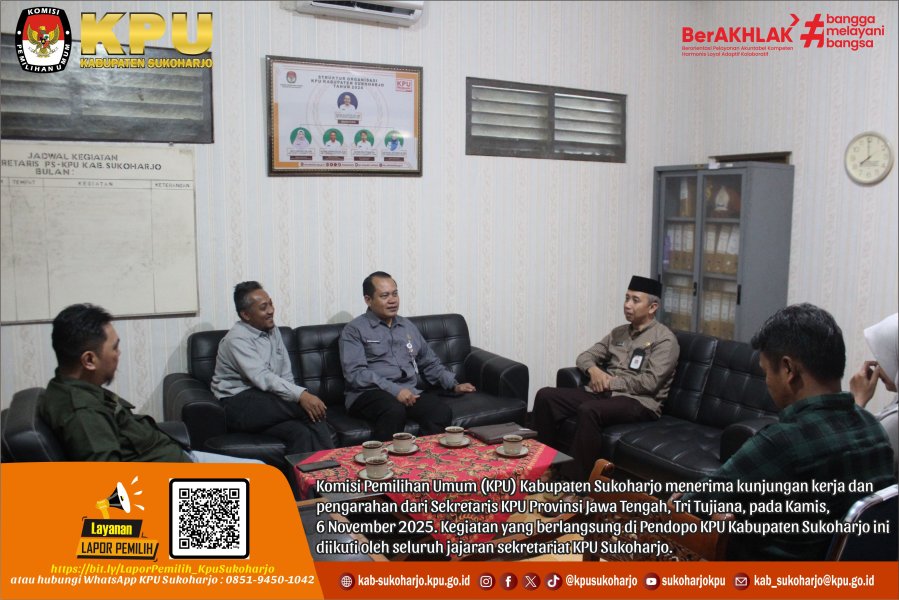 SUKOHARJO – Komisi Pemilihan Umum (KPU) Kabupaten Sukoharjo menerima kunjungan kerja dan pengarahan dari Sekretaris KPU Provinsi Jawa Tengah, Tri Tujiana, pada Kamis, 6 November 2025. Kegiatan yang berlangsung di Pendopo KPU Kabupaten Sukoharjo ini diikuti oleh seluruh jajaran sekretariat KPU Sukoharjo.