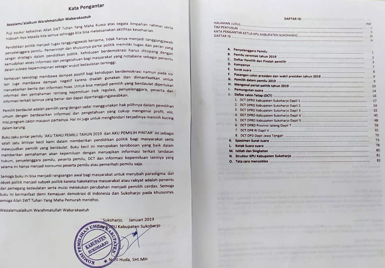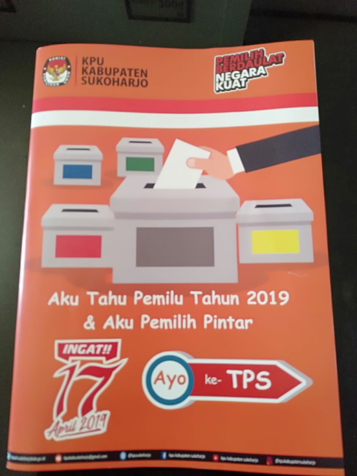 Buku saku pintar pemilu ‘AKU TAHU PEMILU TAHUN 2019 dan AKU PEMILIH PINTAR’ ini sebagai salah satu ikhtiyar kecil KPU Sukoharjo dalam memberikan pendidikan politik bagi masyarakat serta mewujudkan pemilih yang berdaulat. Buku kecil ini merupakan terobosan yang baik dalam memberikan pemahaman akan kepemiluan dengan menyajikan informasi terkait landasan hukum, penyelenggara pemilu, peserta pemilu, DCT dan informasi kepemiluan lainnya yang selama ini hanya menjadi konsumsi peserta pemilu atau pemerhati pemilu saja.