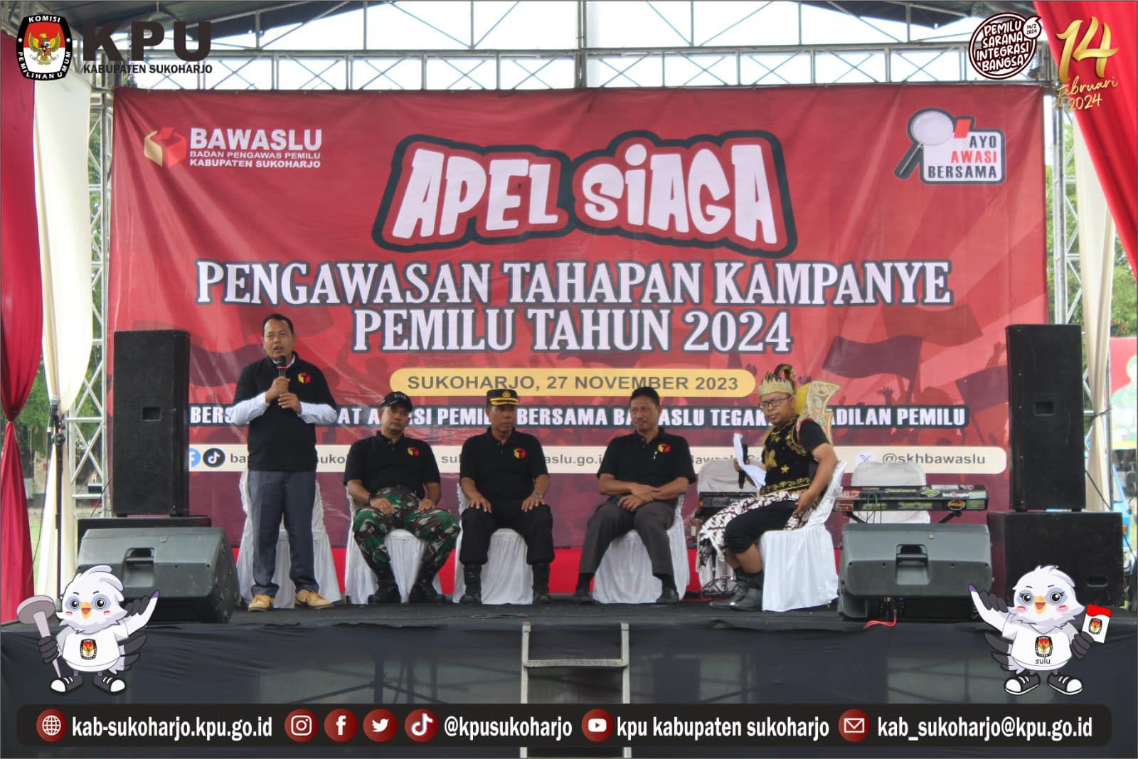 Ketua KPU Sukoharjo, Syakbani Eko Raharjo menghadiri Apel Siaga Pengawasan Tahapan Kampanye Pemilu Tahun 2024 yang digelar Bawaslu Kabupaten Sukoharjo pada hari Senin (27/11/23) di Alun-alun Satya Negara Sukoharjo.