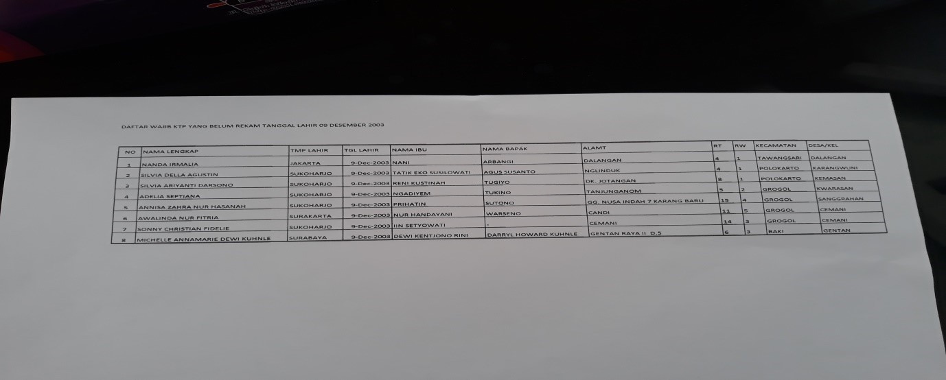 Dikatakan, Progres perekaman KTP EL di kabupaten Sukoharjo per 2 November 2020, sebanyak 3.258 orang belum rekam dan 688.979 yang sudah rekam. Sedangkan bagi warga yang kelahiran tanggal 9 Desember 2003, yang belum rekam hanya 8 orang. Artinya kelahiran 9 Desember 2003, itu menunjukkan yang bersangkutan sudah usia 17 tahun, dan memenuhi syarat sebagai pemilih dalam pemilihan Bupati dan wakil Bupati Sukoharjo tahun 2020.