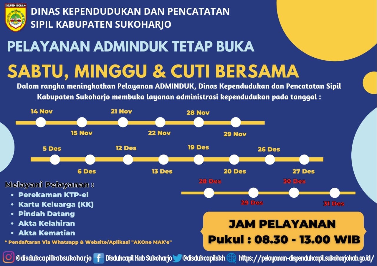 Lebih lanjut Pemerintah Kabupaten Sukoharjo akan melakukan pelayanan adminduk pada hari Sabtu dan Minggu ( week end) mulai tanggal 14 November sampai dengan tanggal 31 Desember 2020, kecuali tanggal 24 dan 25 Desember 2020.