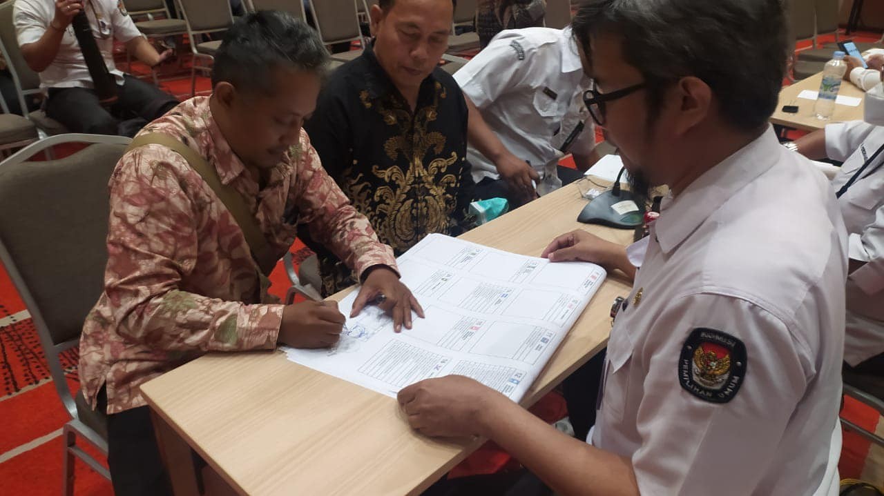 Ketua KPU, Syakbani Eko Raharjo dan Anggota KPU Divisi teknis penyelenggaraan, Bambang Muryanto Bersama dengan Staf Sekretariat KPU Kabupaten Sukoharjo mengikuti acara Persetujuan Master Surat Suara dan DCT DPRD Kabupaten Sukoharjo untuk Pemilu 2024 di Hotel Grand Mercure Harmoni, Jakarta pusat pada Senin (6/11/2023).