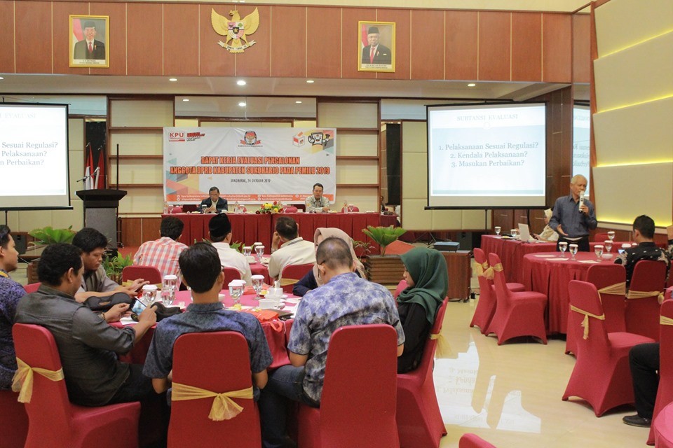 KPUSKH-Komisi Pemilihan Umum (KPU) Kabupaten Sukoharjo adakan Rapat Kerja Evaluasi Pencalonan Anggota DPRD Kabupaten Sukoharjo pada Pemilu 2019 di Hotel Tosan Solobaru, Kamis (24/10). Dalam kesempatan tersebut, sekaligus sosialisasikan pencalonan perseorangan dalam Pemilihan Bupati dan Wakil Bupati Sukoharjo tahun 2020.
