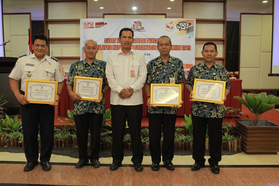 Diakhir acara Ketua KPU Sukoharjo, Nuril Huda menyampaikan penghargaan kepada Stakeholders Sukoharjo yang berpartisipasi atas terselenggaraannya Pemilu 2019 dengan aman dan lancar. Penghargaan disampaikan ke Kesbangpol, Disdukcapil, Satpolpp, Diknas, Dinkes, Dishub, Muhammadiyah, NU, FKUB, LDII, GOW, Komunitas Disabilitas, Polres dan Kodim Sukoharjo serta Bawaslu Sukoharjo. (CCS).