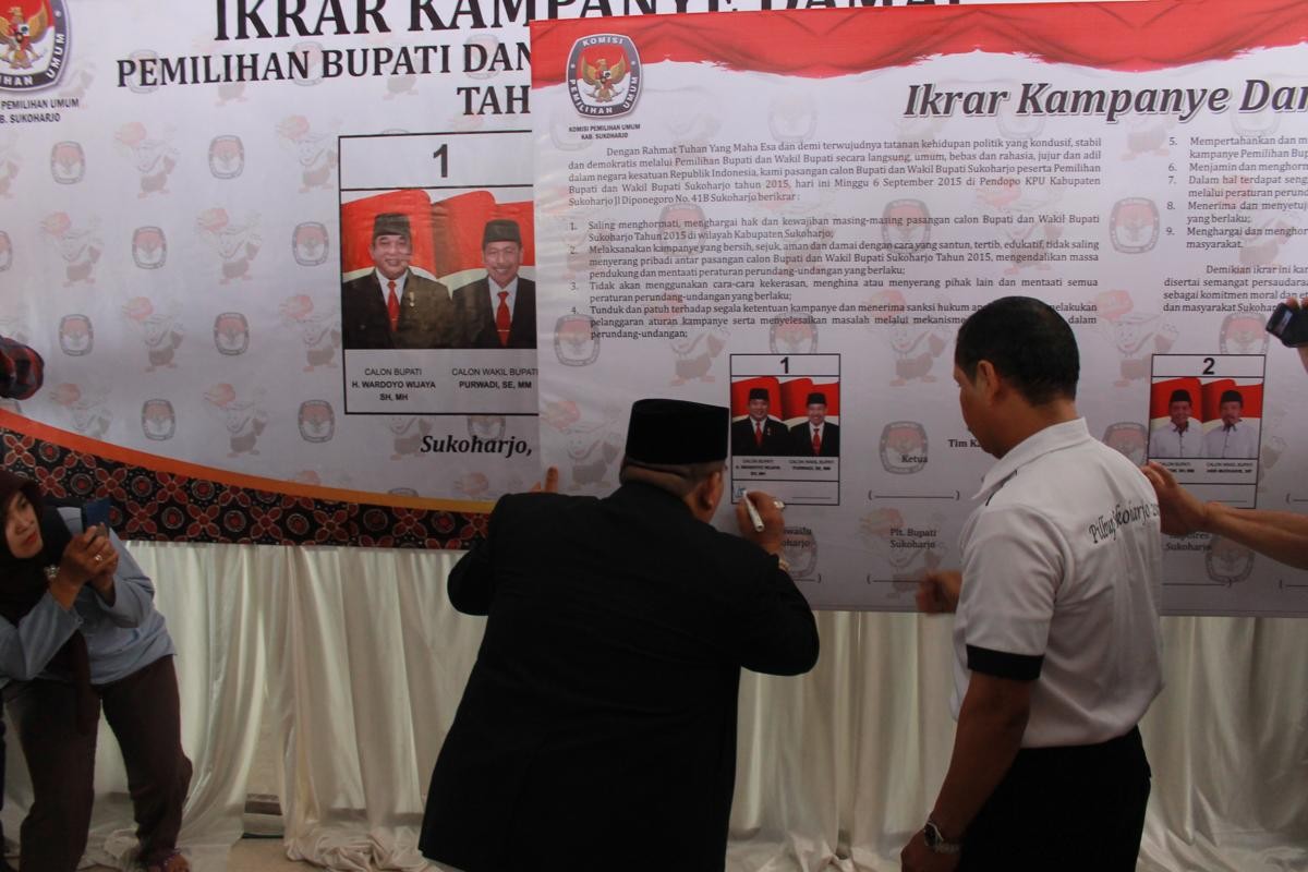 Minggu, tanggal 6 September 2015 bertempat di Pendopo KPU Sukoharjo dilaksanakan IKRAR KAMPANYE DAMAI Pemilihan Bupati dan Wakil Bupati Sukoharjo tahun 2015. Ikrar ini merupakan rangkaian acara Pawai Kampanye damai yang akan dilaksanakan setelah ikrar selesai. Ikrar ini diikuti dua pasang calon , WARDI dan NURANI berserta Partai pengusungnya. Dihadiri pula oleh Plt Bupati Sukoharjo , Drs Agus Santosa , Kapolres Sukoharjo : Amdy Rifai , Panwas Sukoharo dan Pemangku kepentingan yang lain.