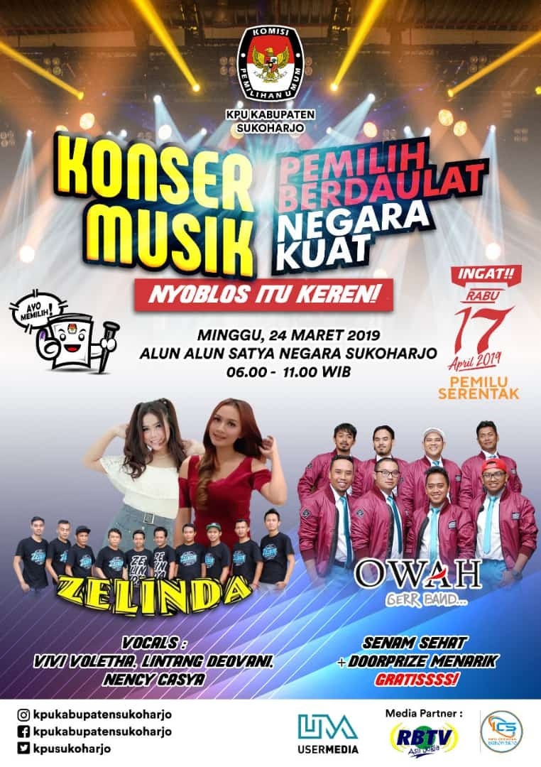 Datang dan Saksikanlah, Konser musik Pemilih berdaulat negara kuat, nyoblos itu keren... Diselenggarakan oleh KPU Sukoharjo pada hari minggu, 24 Maret 2019 di alun alun satya negara, sukoharjo pukul 06.00-11.00 WIB.