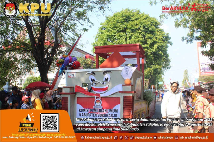 SUKOHARJO – Komisi Pemilihan Umum (KPU) Kabupaten Sukoharjo turut serta dalam kegiatan Pawai Pembangunan 2025 yang digelar oleh Pemerintah Kabupaten Sukoharjo pada Sabtu, 23 Agustus 2025, di kawasan Simpang lima Sukoharjo. Acara ini sekaligus menjadi penutup rangkaian peringatan HUT ke-80 Kemerdekaan Republik Indonesia.