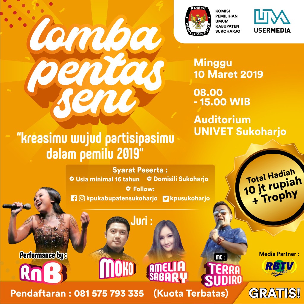 Hadiri dan Ikuti, LOMBA PENTAS SENI "kreasimu wujud partisipasimu dalam pemilu 2019" pada minggu, 10 maret 2019, pukul 08.00 - 15.00 di auditorium UNIVET Sukoharjo. TOTAL HADIAH 10 juta rupiah + Thropy #sosialisasipemilu#pemilihberdaulatnegarakuat#sukseskanpemilu2019