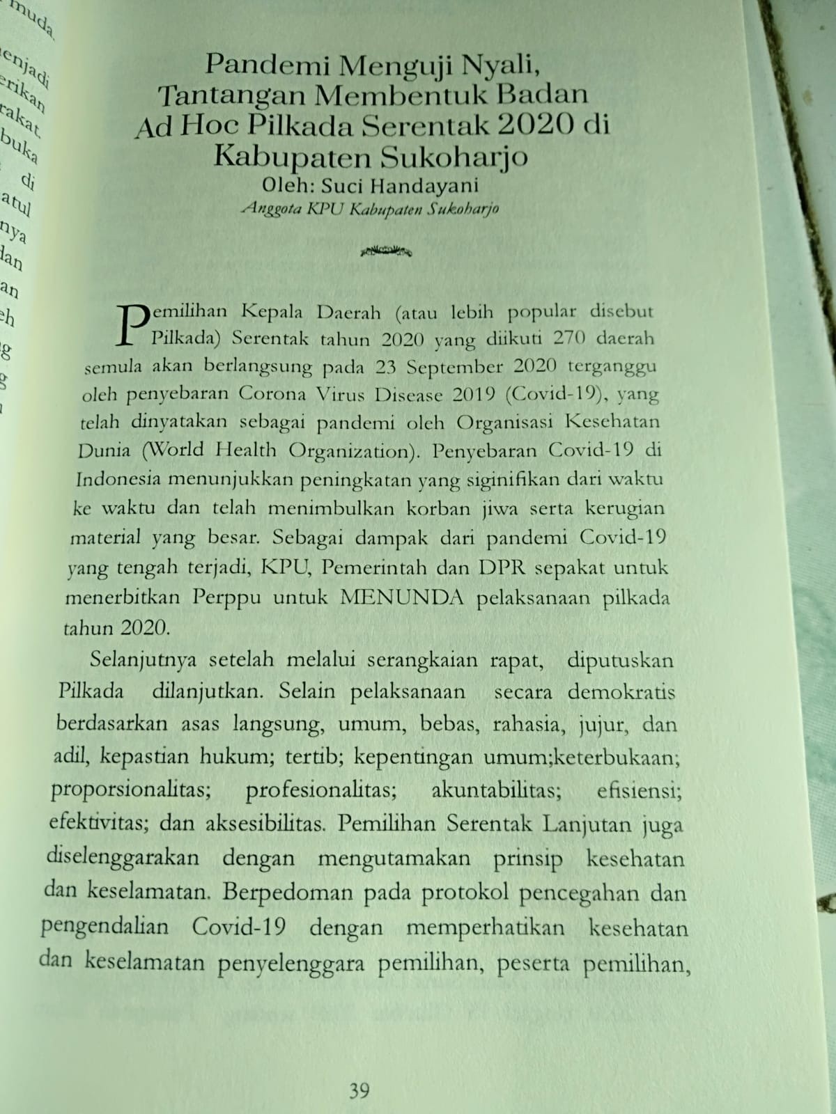 Salah satu tulisan dalam buku ini berjudul ‘Pandemi Menguji Nyali, Tantangan Membentuk Badan Ad Hoc Pilkada Serentak 2020 di Kabupaten Sukoharjo’ (hal 39), ditulis Suci Handayani anggota KPU Sukoharjo.