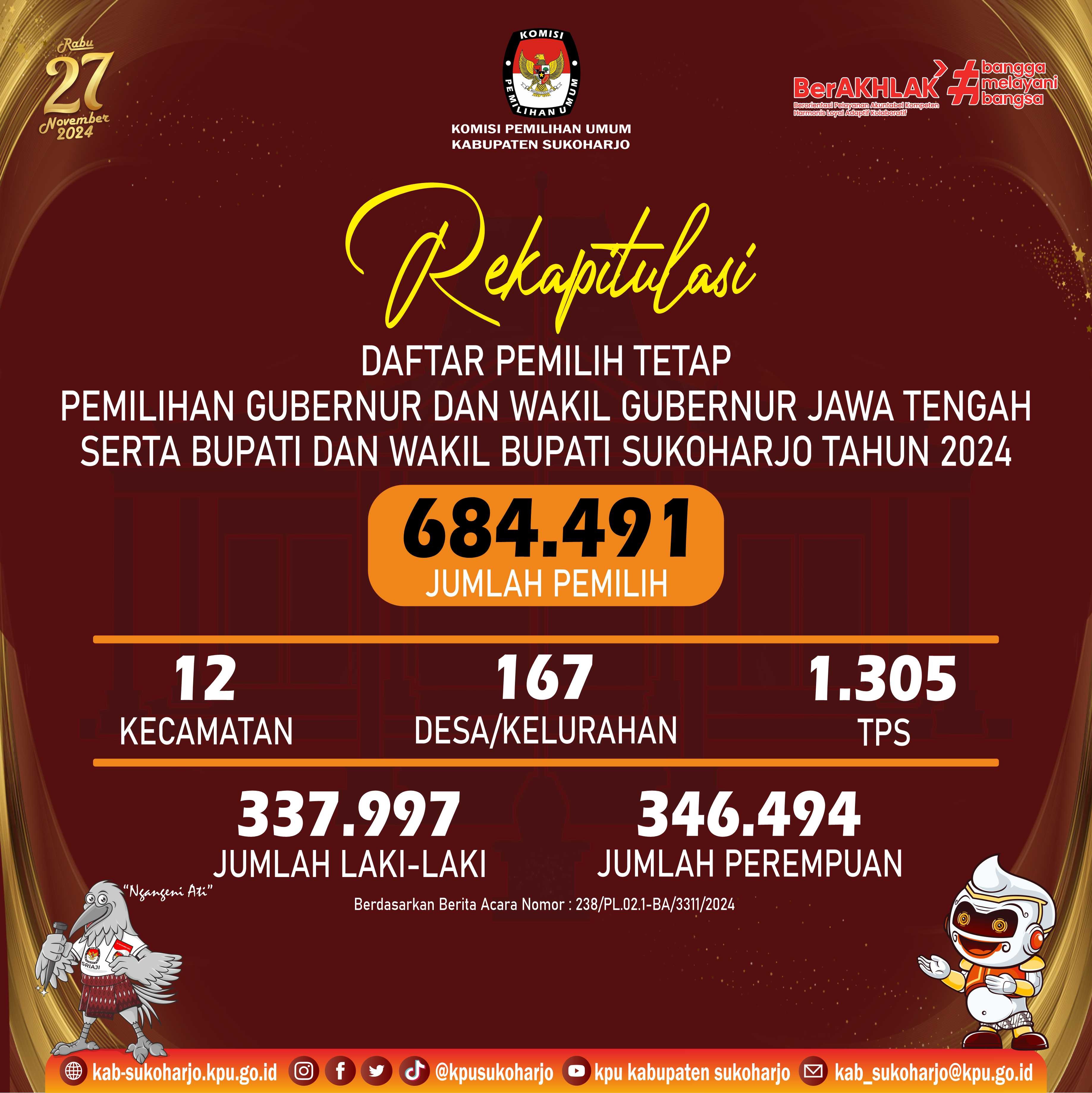 Berikut ini Kami Informasikan Daftar Pemilih Kabupaten Sukoharjo setelah Rapat Pleno Terbuka Rekapitulasi dan Penetapan DPT tingkat Kabupaten Pemilihan Gubernur dan Wakil Gubernur Jawa Tengah serta Bupati dan Wakil Bupati Sukoharjo Tahun 2024.