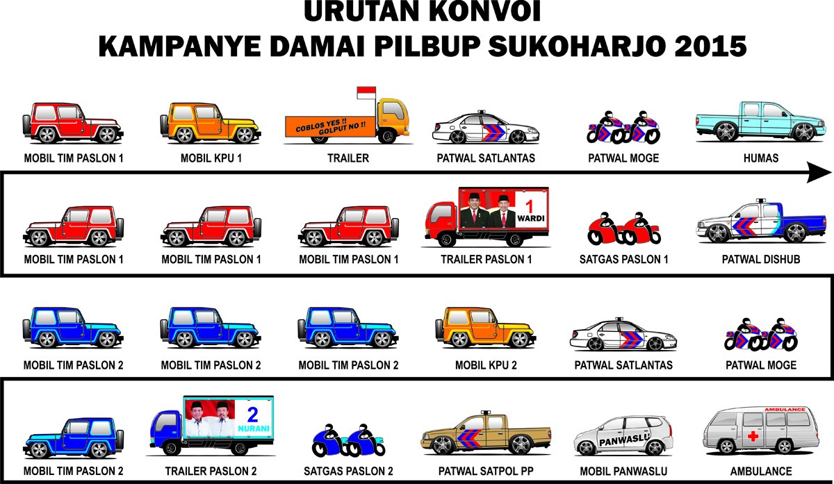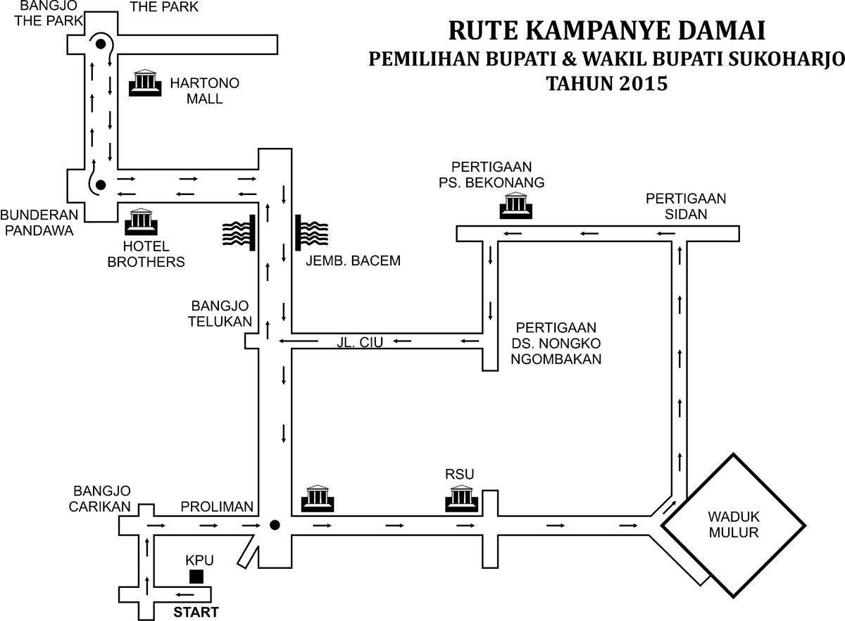 Minggu, 6 September 2015 setelah dilaksanakannya Ikrar Kampanye Damai kemudian dilanjutkan dengan Pawai Kampanye damai diikuti semua Paslon , Panwas, KPU Sukoharjo, Dishub Sukoharjo dll. Pawai ini dilaksanakan dengan Rute Seperti dibawah ini: