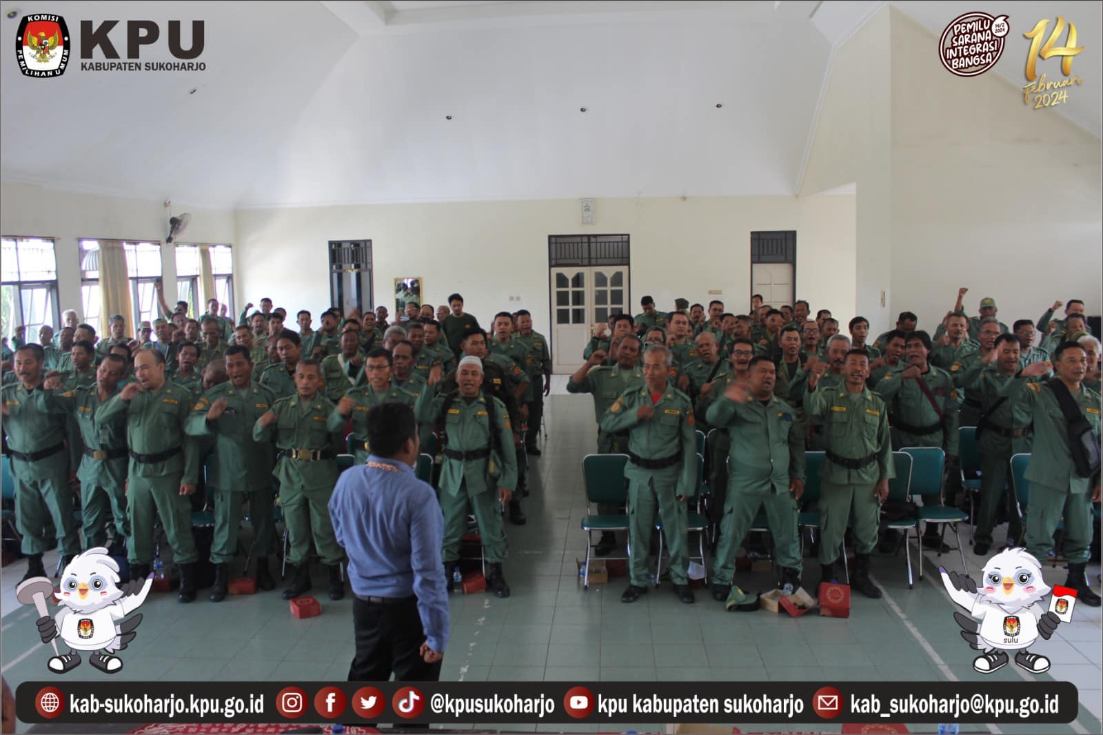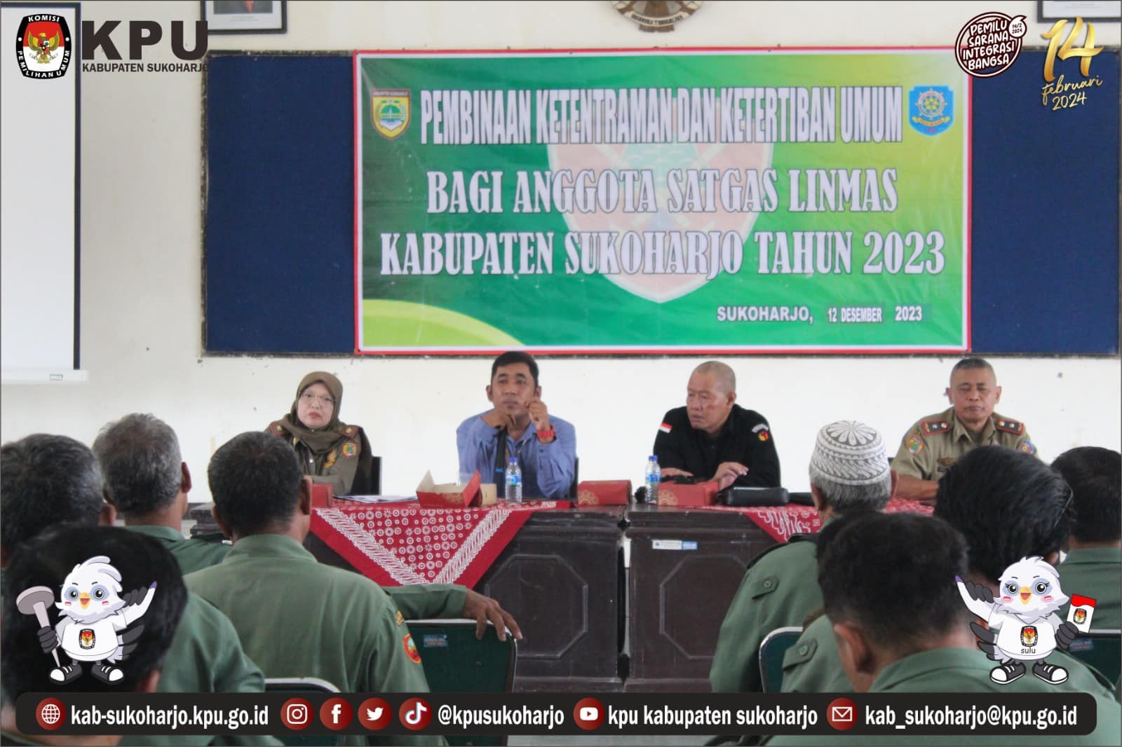 Dalam kesempatan tersebut Anggota KPU Kabupaten Sukoharjo Divisi Sosdiklih Parmas & SDM, Moerwedhy Tanomo Menyampaikan materi Sosialisasi Tahapan Pemilu 2024 yang sebentar lagi dilaksanakan. Beliau juga mengingatkan bahwa linmas untuk selalu menjaga kesehatan dalam peningkatan keamanan saat pemilihan tahun 2024 nanti.
