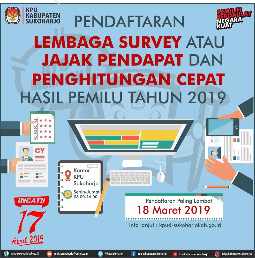 KPUSKH-KPU Kabupaten Sukoharjo membuka pendaftaran lembaga survey atau jajak pendapat dan penghitungan cepat hasil Pemilu taun 2019. Berikut ini kami sampaikan Pendaftaran Lembaga Survey Pemilu 2019 di Sukoharjo