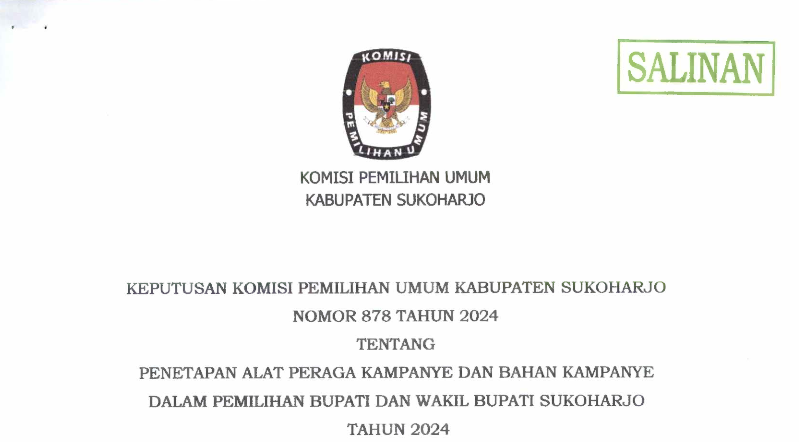 PENETAPAN ALAT PERAGA KAMPANYE DAN BAHAN KAMPANYE PEMILIHAN BUPATI DAN WAKIL BUPATI SUKOHARJO TAHUN 2024 Senin, 30 September 2024 11:43 390 Berikut Kami sampaikan Surat Keputusan Komisi Pemilihan Umum Kabupaten Sukoharjo tentan Penetapan Alat peraga Kampanye dan Bahan Kampanye pemilihan Bupati dan Wakil Bupati Sukoharjo Tahun 2024 Bagikan: Telah dilihat 390 kali