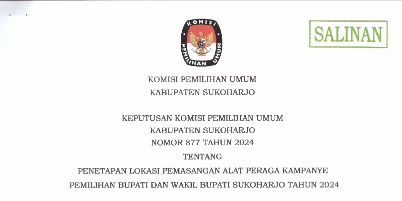 PENETAPAN LOKASI PEMASANGAN ALAT PERAGA KAMPANYE PEMILIHAN BUPATI DAN WAKIL BUPATI TAHUN 2024 Senin, 30 September 2024 11:39 413 Berikut kami sampaikan Surat Keputusan Komisi Pemilihan Umum Kabupaten Sukoharjo tentang Penetapan Lokasi Pemasangan Alat Peraga Kampanye pemilihan Bupati dan Wakil Bupati Sukoharjo tahun 2024... Bagikan: Telah dilihat 413 kali