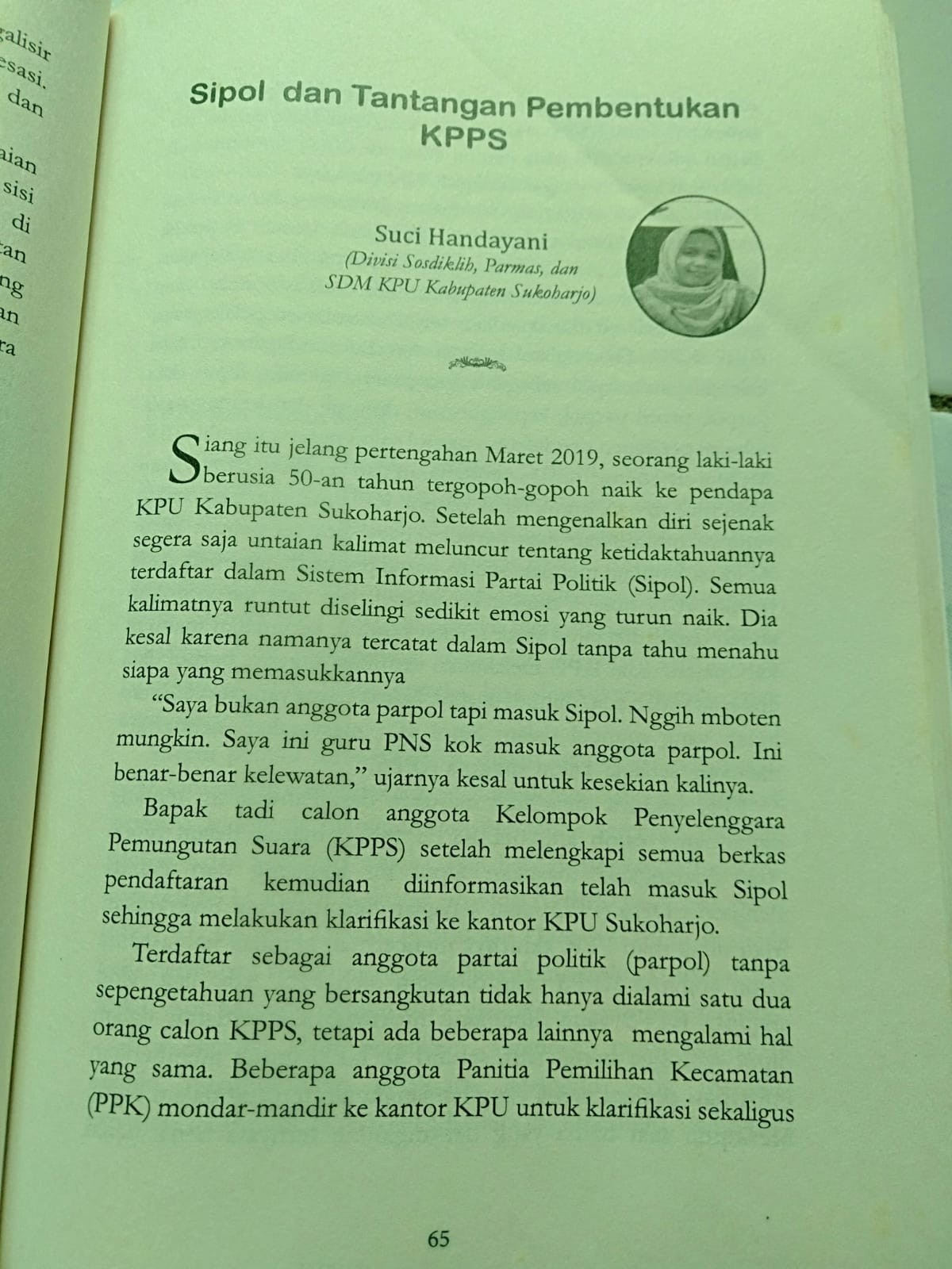 Salah satu tulisan dalam buku dari anggota KPU Sukoharjo Divisi Sosdiklihparmas dan SDM, Suci Handayani yang menuliskan opini berjudul Sipol dan Tantangan Pembentukan KPPS (halaman 65).