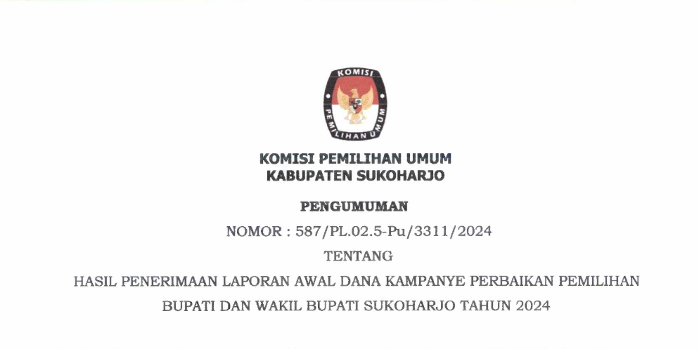 Pengumuman Hasil LADK Perbaikan Pemilihan Bupati dan Wakil Bupati Sukoharjo Tahun 2024 Jumat, 27 September 2024 14:15 392 Berikut kami Informasikan Pengumuman Nomor 587/PL.02.5-Pu/3311/2024 tentang Hasil Laporan Awal Dana Kampanye Perbaikan Pemilihan Bupati dan Wakil Bupati Sukoharjo Tahun 2024... Bagikan: Telah dilihat 392 kali
