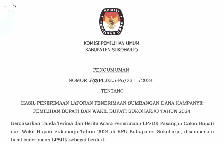 PENGUMUMAN LPSDK PEMILIHAN BUPATI DAN WAKIL BUPATI SUKOHARJO TAHUN 2024 Sabtu, 26 Oktober 2024 13:17 408 Berikut kami sampaikan Pengumuman Laporan Penerimaan Sumbangan Dana Kampanye Pemilihan Bupati dan Wakil Bupati Sukoharjo Tahun 2024... Bagikan: Telah dilihat 408 kali