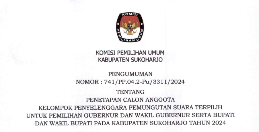 Pengumuman Penetapan Calon Anggota KPPS untuk Pemilihan Gubernur dan Wakil Gubernur serta Bupati dan Wakil Bupati Kabupaten Sukoharjo Tahun 2024 Kamis, 07 November 2024 10:10 429 Berikut Kami Informasikan Pengumuman Penetapan Calon Anggota KPPS untuk Pemilihan Gubernur dan Wakil Gubernur serta Bupati dan Wakil Bupati Kabupaten Sukoharjo Tahun 2024.. Bagikan: Telah dilihat 429 kali
