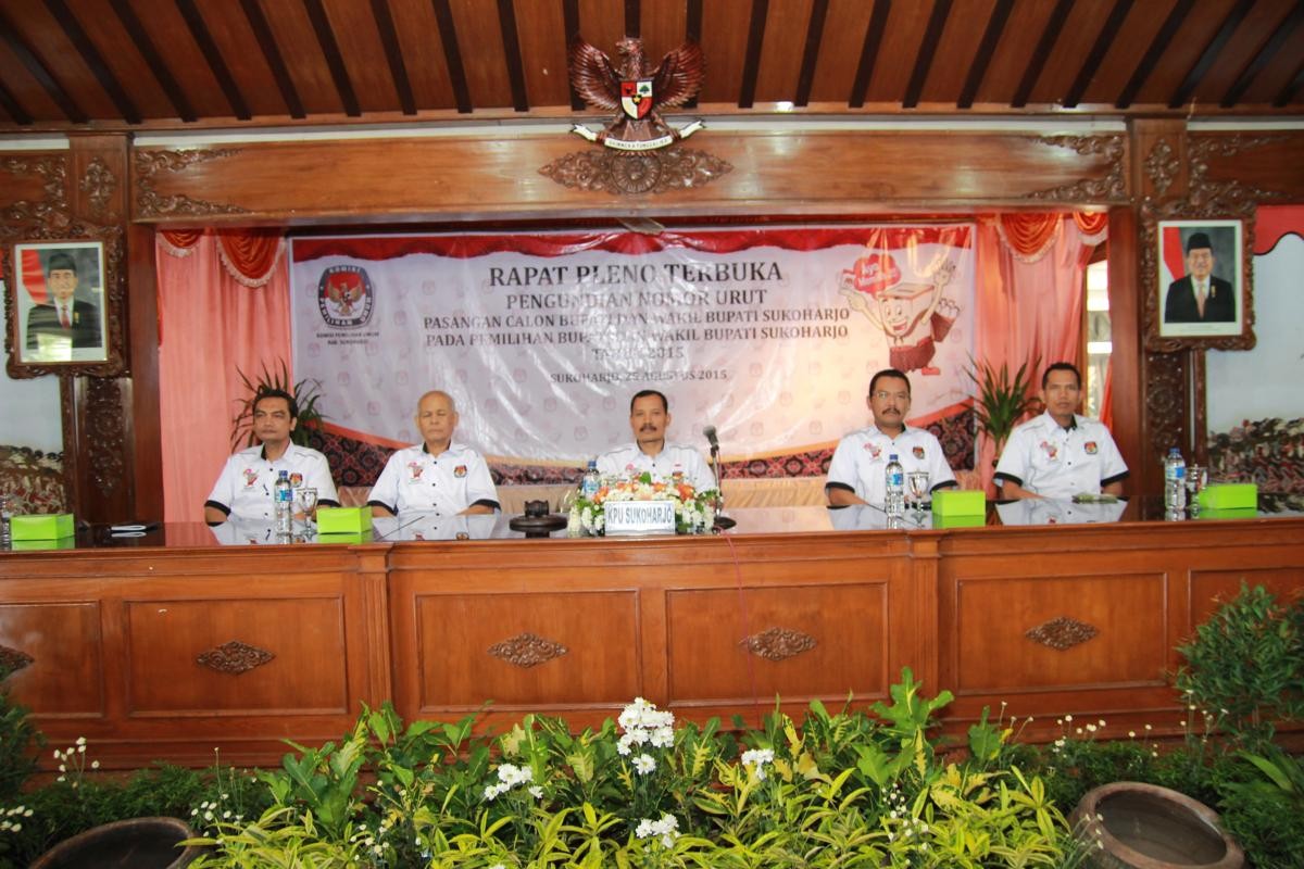 Selasa, 25 Agustus bertempat di Gedung "Graha Satya Praja" Kabupaten Sukoharjo diadakan Pengundian Nomor Urut pasangan Calon Bupati dan Wakil Bupati Sukoharjo tahun 2015. Acara ini dihadiri oleh Kedua Pasang calon, WARDI -Wardoyo-Purwadi dan NURANI - Nurdin -Anis , beserta Partai Pengusung dan para pendukungnya, Kemudian para pemangku kepentingan, Camat se-Kab Sukoharjo, PPK Se-Kabupaten Sukoharjo.