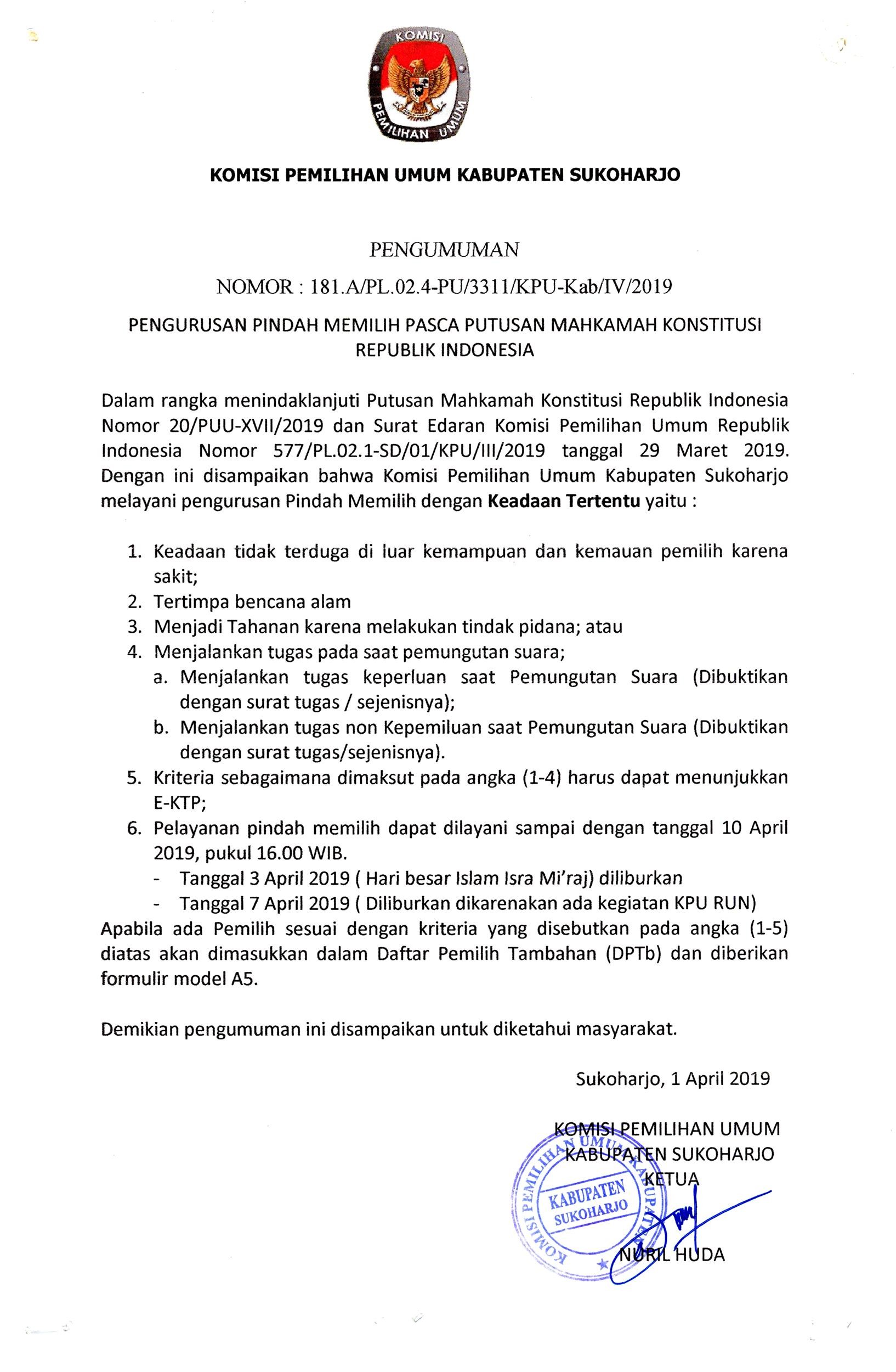 Berikut ini kami sampaikan kepengurusan Pindah Pemilih Pasca Putusan Mahkamah Konstitusi Republik Indonesia :