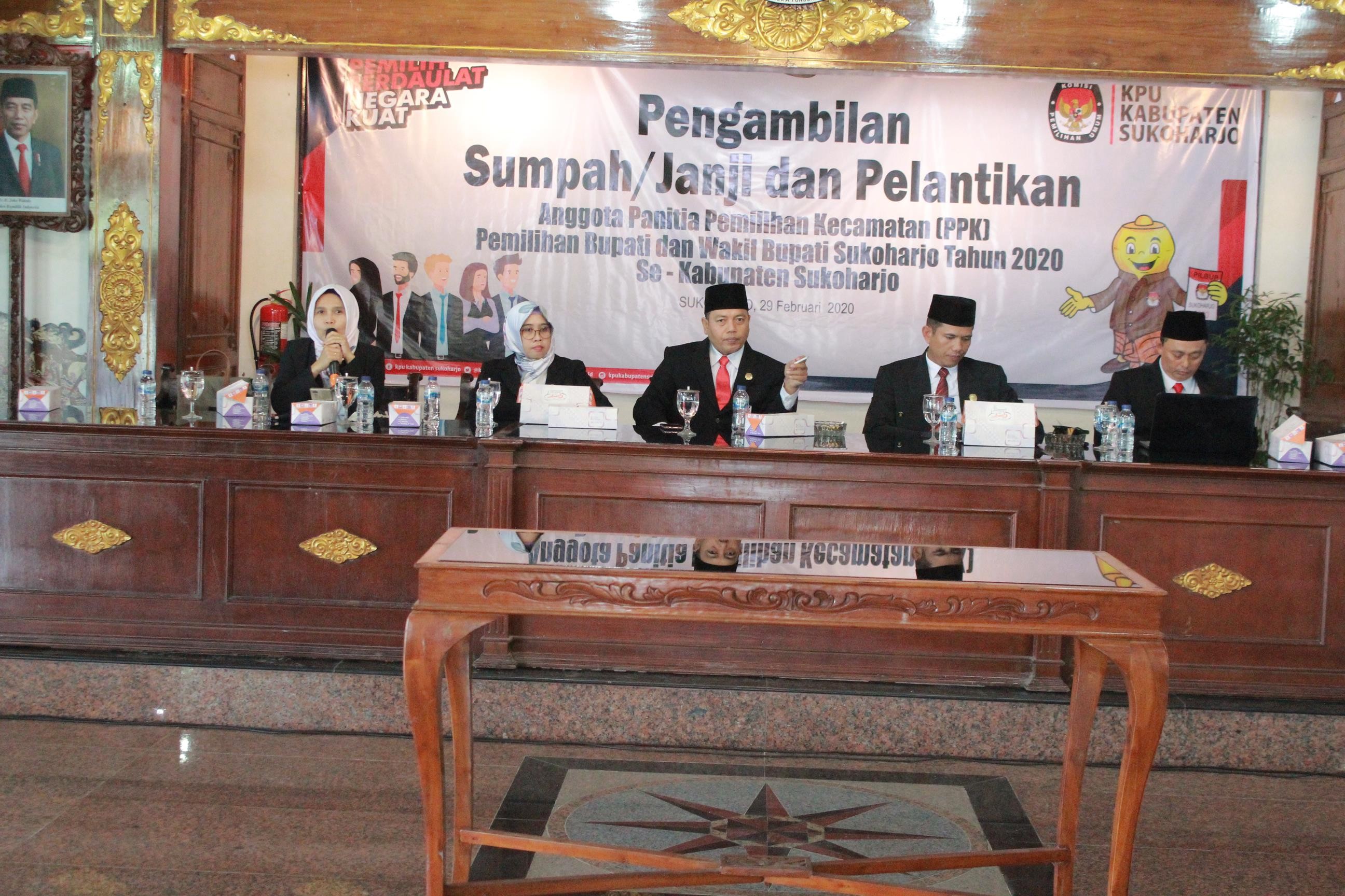 KPU SKH-Sebanyak 60 Panitia Pemilihan Kecamatan (PPK) Se Kabupaten Sukoharjo pada Sabtu (29/2) dilantik oleh Komisi Pemilihan Umum (KPU) Sukoharjo. Pelantikan dilakukan di Pendopo Graha Satya Praja (GSP) Pemkab Sukoharjo. Dalam sambutannya, Ketua KPU Sukoharjo meminta PPK terpilih meneguhkan diri dalam penyelenggaraan Pilbup Sukoharjo yang berintegritas.