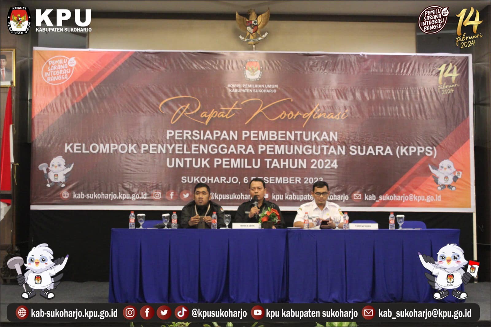 kamu perlu tahu bahwa jadwal pembentukan KPPS dimulai 11 Desember 2023. KPU Kabupaten Sukoharjo menggelar Rapat koordinasi Persiapan Pembentukan Kelompok Penyelenggara Pemungutan Suara (KPPS) untuk Pemilihan Umum Tahun 2024 di Hotel Brothers Sukoharjo, Rabu (06/12/2023).