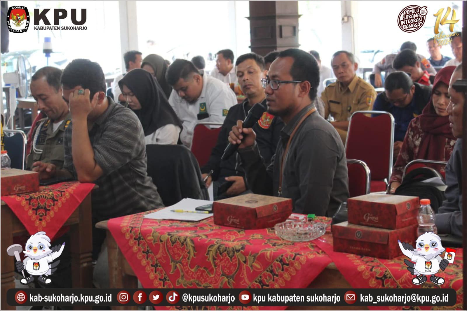 KPU Kabupaten Sukoharjo kembali mengukuhkan komitmen untuk menyelenggarakan Pemilihan Umum 2024 yang berkualitas dengan menggelar Rapat Koordinasi Kampanye Dan Dana Kampanye bersama Admin SIKADEKA Partai Politik Peserta Pemilu 2024. Acara ini berlangsung pada Senin, 04 Desember 2023, di pendopo KPU Kabupaten Sukoharjo.