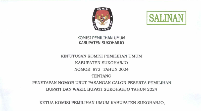 SALINAN SK PENETAPAN NOMOR URUT PASANGAN CALON BUPATI DAN WAKIL BUPATI SUKOHARJO TAHUN 2024 Selasa, 23 Januari 2024 16:00 411 BERIKUT KAMI SAMPAIKAN SALINAN SK PENETAPAN NOMOR URUT PASANGAN CALON BUPATI DAN WAKIL BUPATI SUKOHARJO TAHUN 2024.... Bagikan: Telah dilihat 411 kali