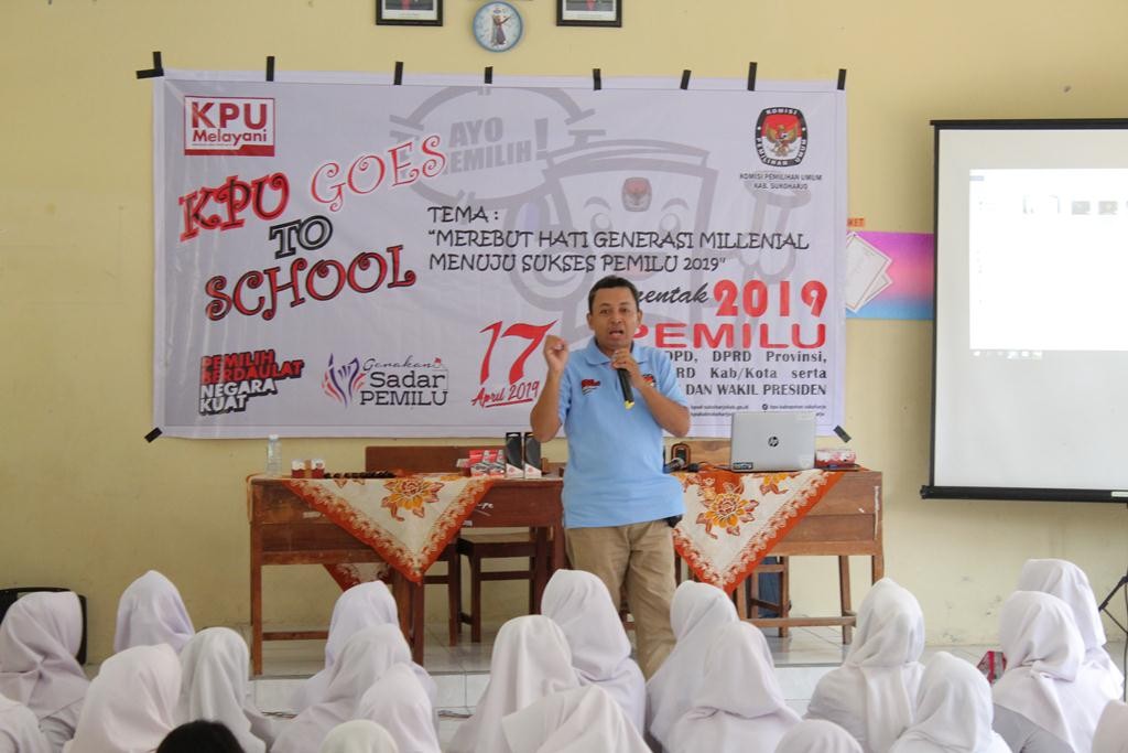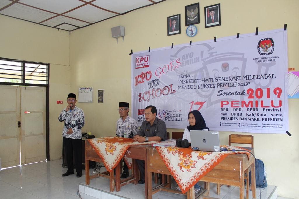 KPUSKH-Komisi Pemilihan Umum (KPU) Kabupaten Sukoharjo mengadakan sosialisasi pemilu kepada pemilih pemula yang bertajuk Goes To School di SMA 1 Bulu Sukoharjo, Senin (16/11/2018).