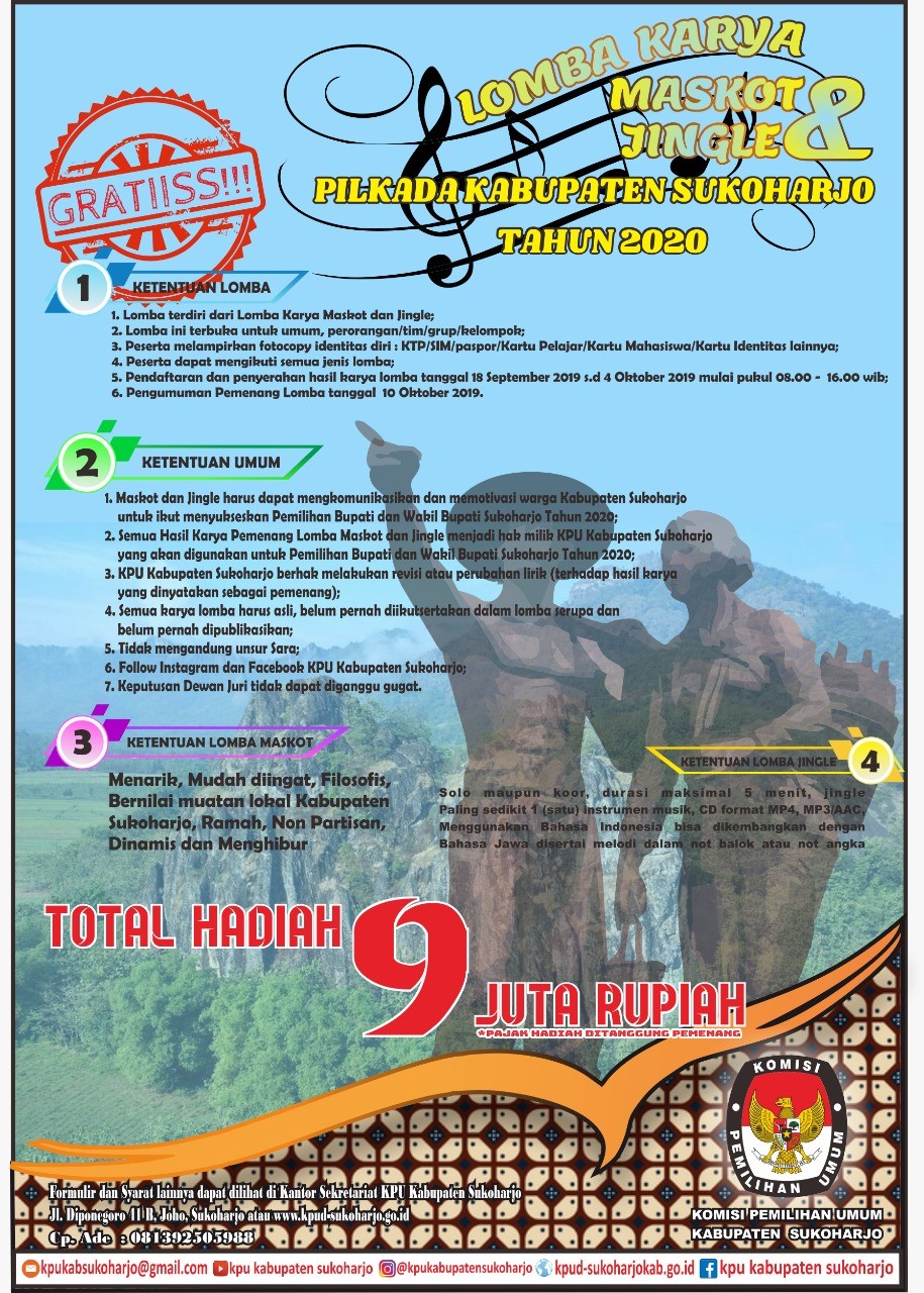 Sayembara ini dapat diikuti oleh perorangan maupun kelompok dengan batas akhir penerimaan hasil karya oleh panitia tanggal 4 Oktober 2019, pukul 16.00 WIB di Kantor Sekretariat KPU Kabupaten Sukoharjo, Jl. Diponegoro 41B Joho, Sukoharjo atau dapat dikirim melalui jasa pengiriman.