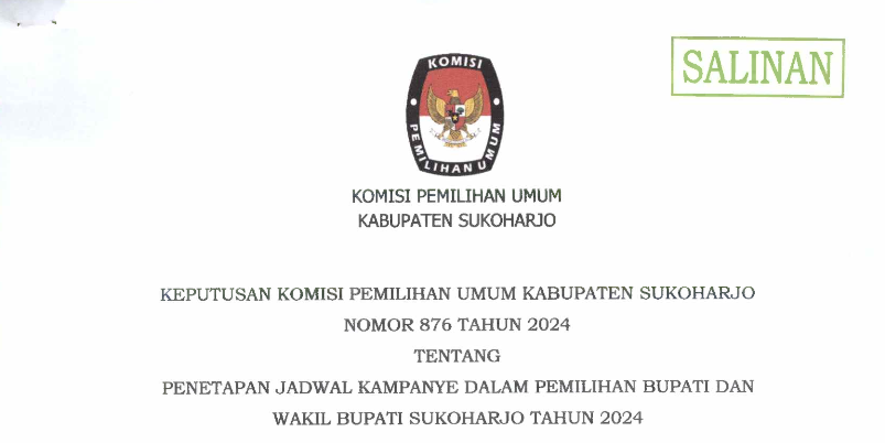 SK PENETAPAN JADWAL KAMPANYE PEMILIHAN BUPATI DAN WAKIL BUPATI SUKOHARJO TAHUN 2024 Senin, 30 September 2024 11:49 413 Berikut kami sampaikan Surat Keputusan Komisi Pemilihan Umum Kabupaten Sukoharjo tahun 2024 tentang Penetapan Jadwal Kampanye Pemilihan Bupati dan Wakil Bupati Sukoharjo Tahun 2024 Bagikan: Telah dilihat 413 kali