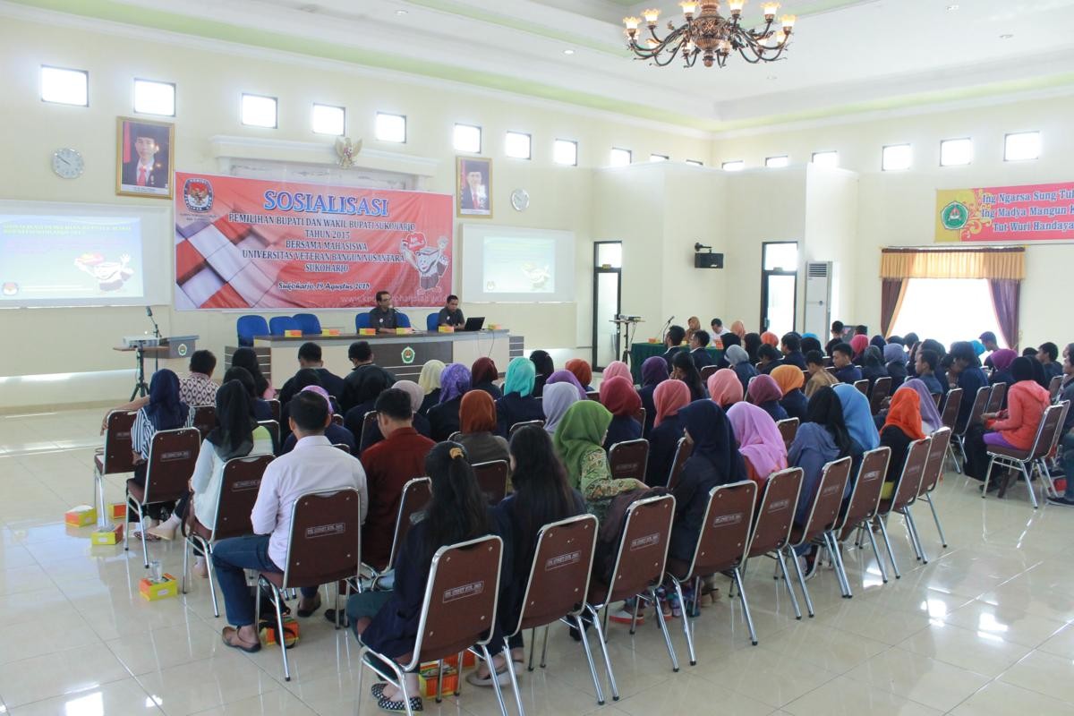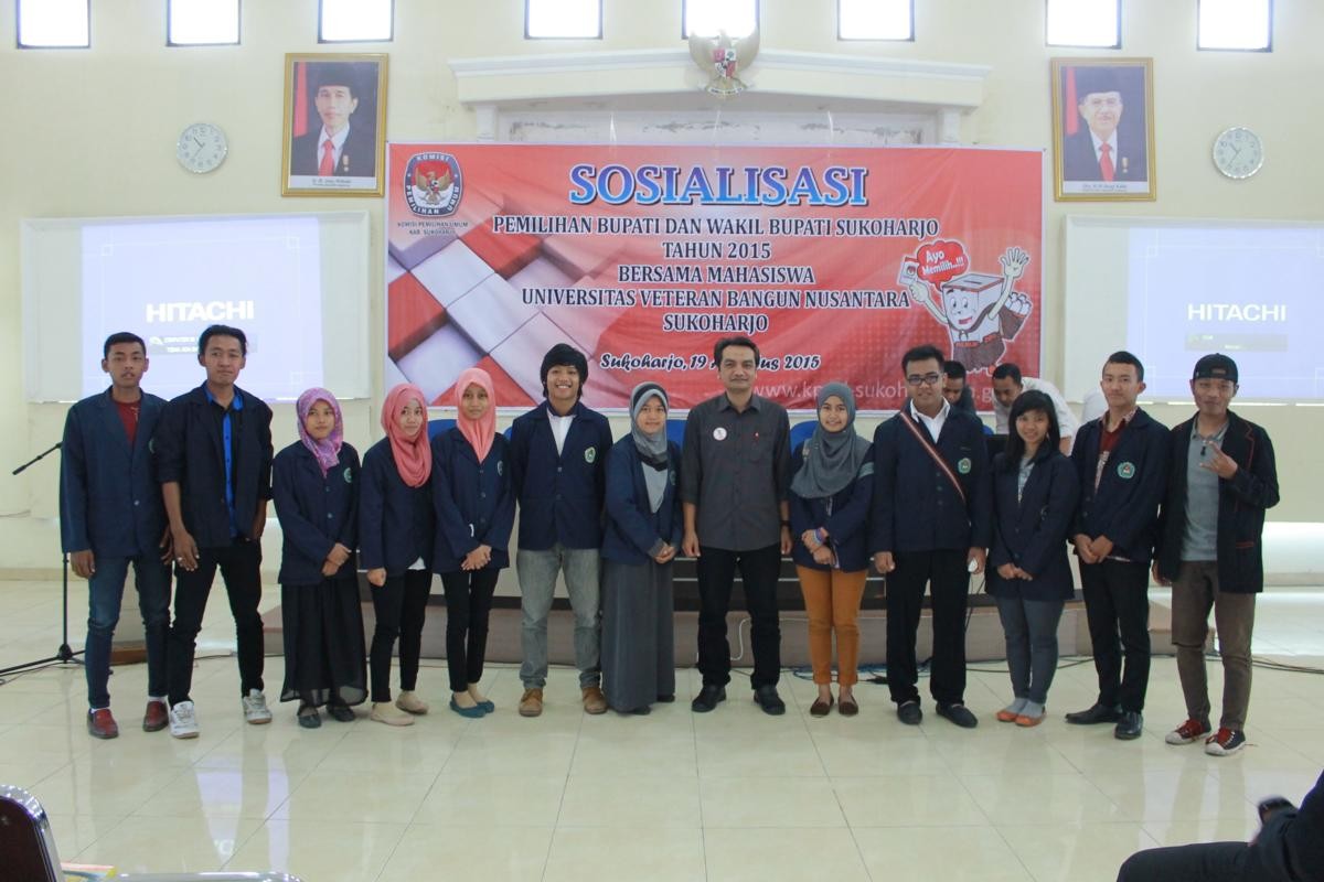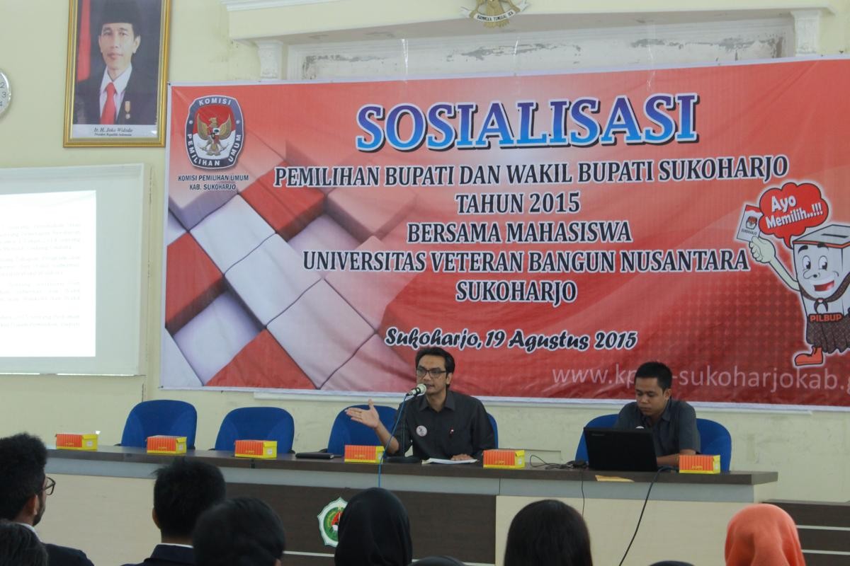 Dalam acara sosialisasi Pemilihan Bupati dan Wakil Bupati Sukoharjo Tahun 2015 bersama mahasiswa Univet Sukoharjo bertempat Di Ruang Seminar Univet, pukul 09.00 tanggal 19 Agustus 2015 bertempat di Ruang Semiar Univet dihadiri oleh Ketua Kpu Kuswanto SH MH ketua divisi sosialisasi Yulianto Sudrajat S.Sos dan Pembantu Rektor 3 dari Univet Bp.Sodikin ST.MT dan mahasiwa univet dari beberapa fakultas sudah dilaksanakan.