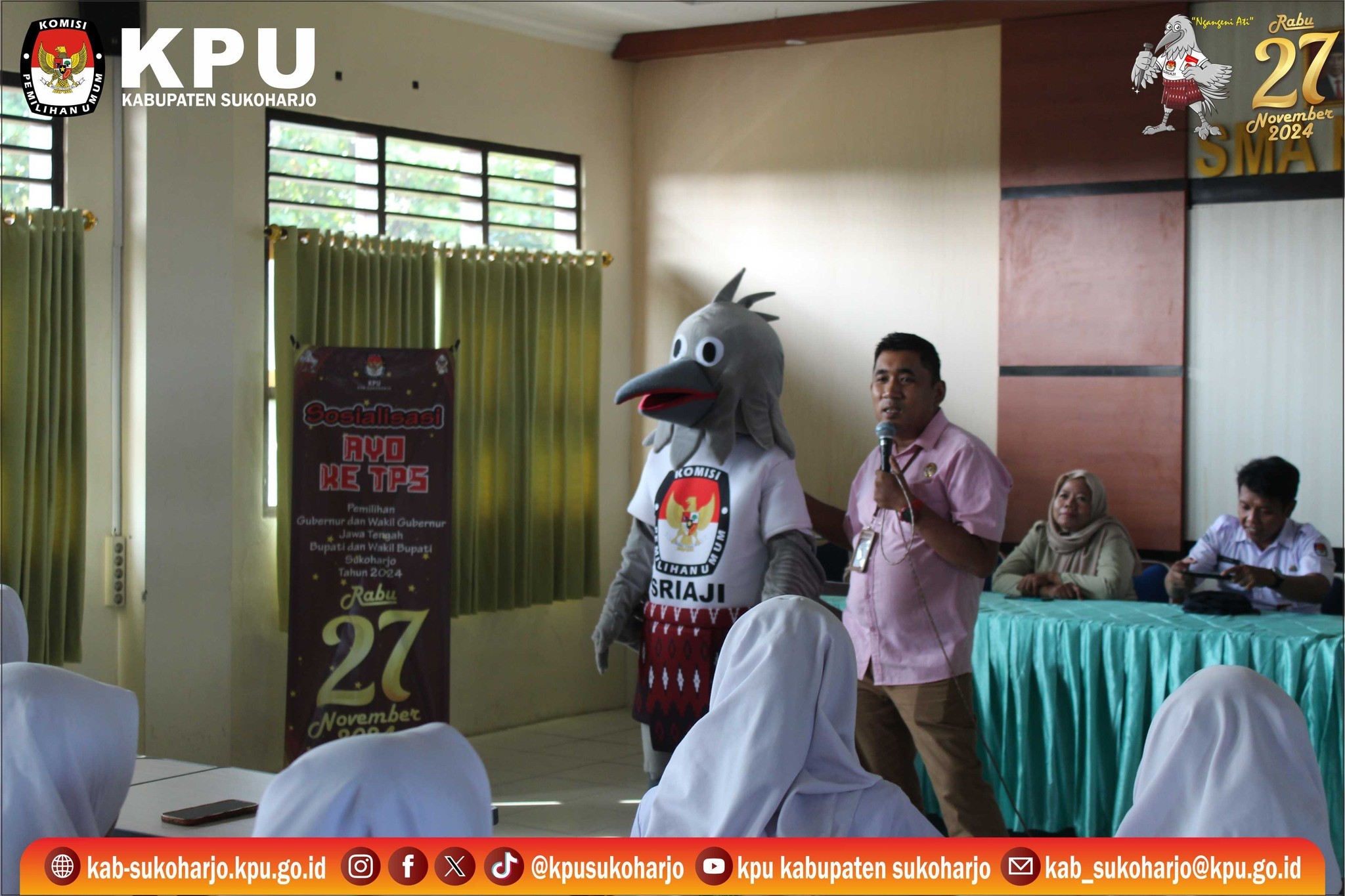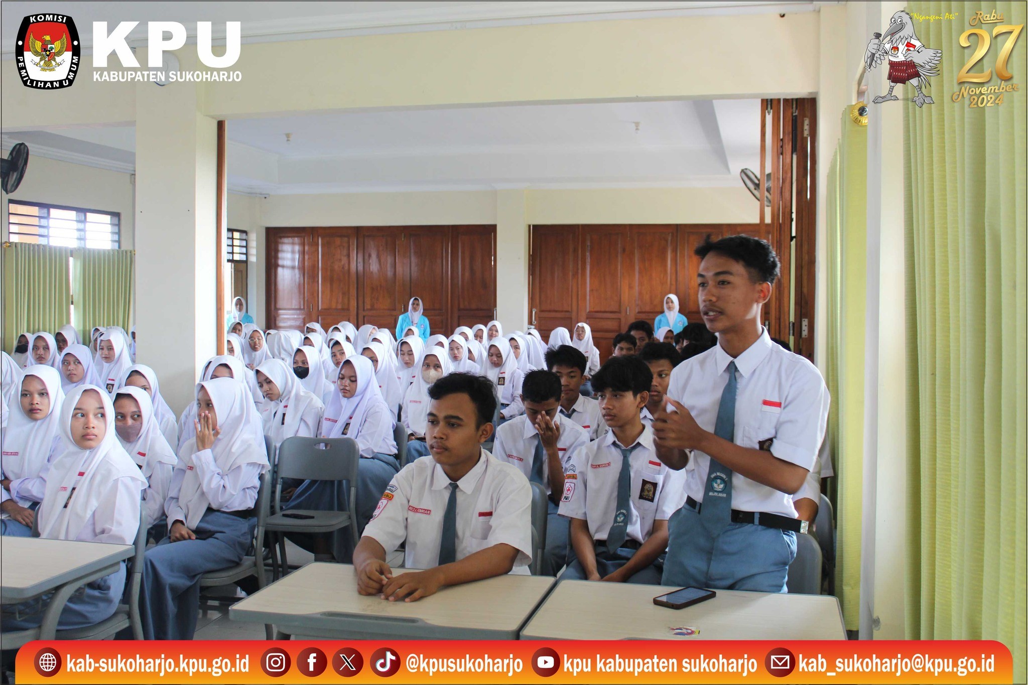 Anggota KPU Kabupaten Sukoharjo Murwedhy Tanomo Melaksanakan Kegiatan Sosialisasi pada Hari Senin, 10 Juni 2024 kepada Pemilih Pemula Siswa-siswi SMA Negeri 1 Mojolaban.