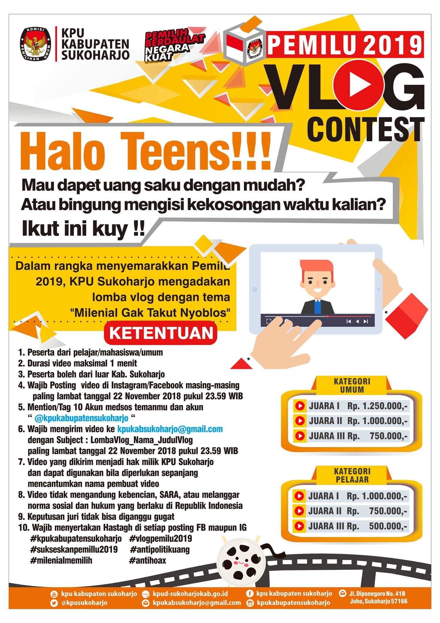 Haloo Teens!!!! Mau dapet uang saku dengan mudah? Atau bingung mengisi kekosongan waktu kalian? Ikut ini kuy !! Dalam rangka menyemarakkan Pemilu 2019, KPU Sukoharjo mengadakan lomba vlog dengan tema "Milenial Gak Takut Nyoblos.