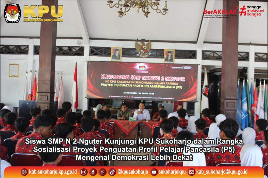 Sukoharjo, 24 April 2025 – Sebanyak 115 siswa dan 7 guru pendamping dari SMP Negeri 2 Nguter melakukan kunjungan edukatif ke Kantor Komisi Pemilihan Umum (KPU) Kabupaten Sukoharjo, Kamis (24/4). Kegiatan ini merupakan bagian dari Proyek Penguatan Profil Pelajar Pancasila (P5), yang bertujuan untuk memperkenalkan sistem demokrasi serta proses pemilu secara langsung kepada para pelajar. Kedatangan rombongan disambut hangat oleh Ketua KPU Kabupaten Sukoharjo, Syakbani Eko Raharjo, bersama Divisi SDM dan Parmas Moerwedhy Tanomo, Divisi Teknis Penyelenggaraan Bambang Moeryanto, dan didampingi oleh Sekretaris KPU, Boedi Sulistyo. Dalam sambutannya, Syakbani Eko Raharjo menyampaikan apresiasi atas kunjungan tersebut dan mengajak para siswa untuk mulai mengenal pentingnya demokrasi sejak dini. Selanjutnya Moerwedhy Tanomo menyampaikan materi dengan tema mengenal suara demokrasi. Ia juga membuka sesi tanya jawab yang berlangsung interaktif, di mana para siswa antusias bertanya tentang berbagai istilah dalam pemilu, termasuk makna dari singkatan TPS (Tempat Pemungutan Suara) dan tahapan dalam proses pemilihan umum. Setelah sesi dialog, kegiatan dilanjutkan dengan melihat Bersama tayangan tatacara pemungutan suara di TPS kemudin dilanjutkan dengan kunjungan ke Rumah Pintar Pemilu (RPP) KPU Sukoharjo. Di sana, para siswa mendapatkan penjelasan mengenai sejarah pemilu, peran KPU, serta berbagai informasi terkait penyelenggaraan pemilu di Indonesia melalui media edukatif yang interaktif dan menarik. Kegiatan ini diharapkan dapat menjadi pengalaman berharga bagi para pelajar dalam memahami pentingnya demokrasi dan peran aktif warga negara dalam proses pemilihan umum.